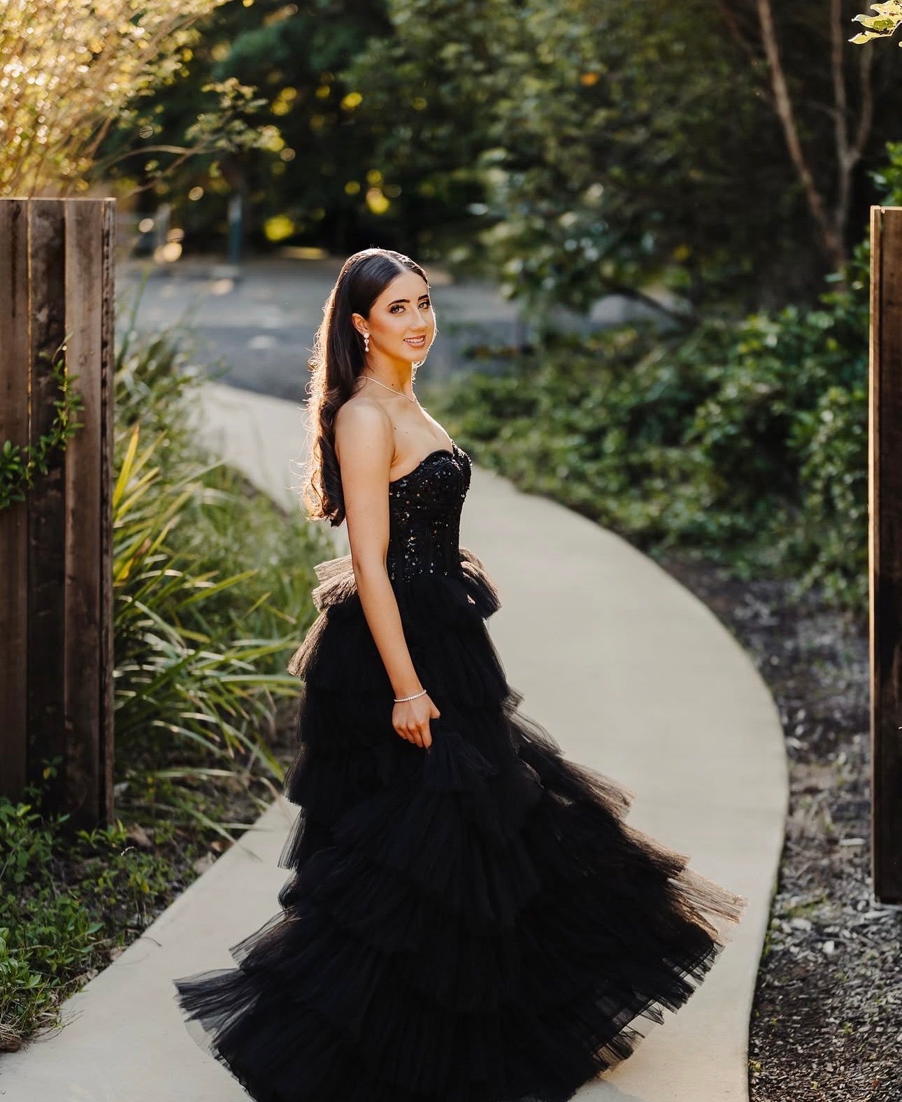 Ella is wearing the Celeste Layered Strapless Gown - Black - Size 6