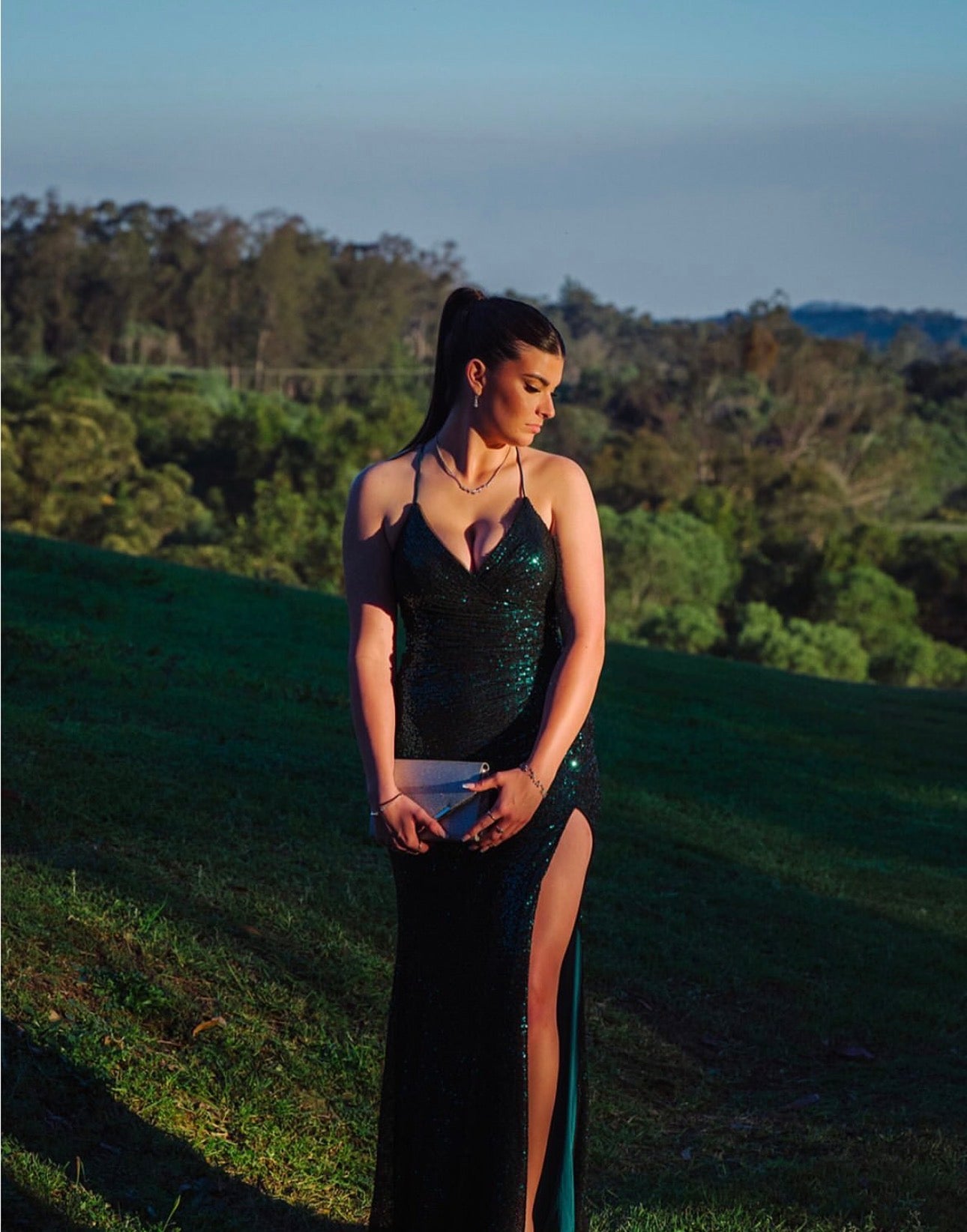 Tilah is wearing the Neveda Sequin Gown - Emerald - Size 10