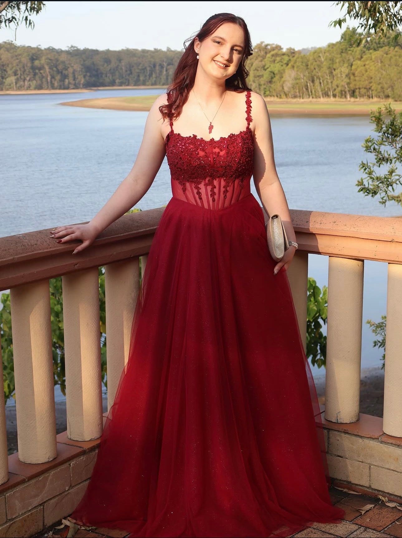 Chloe is wearing the Lilla Corset Gown - Ruby - Size 10