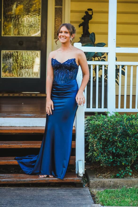 Ella is wearing the Niki Corset Satin Gown - Navy - Size 6