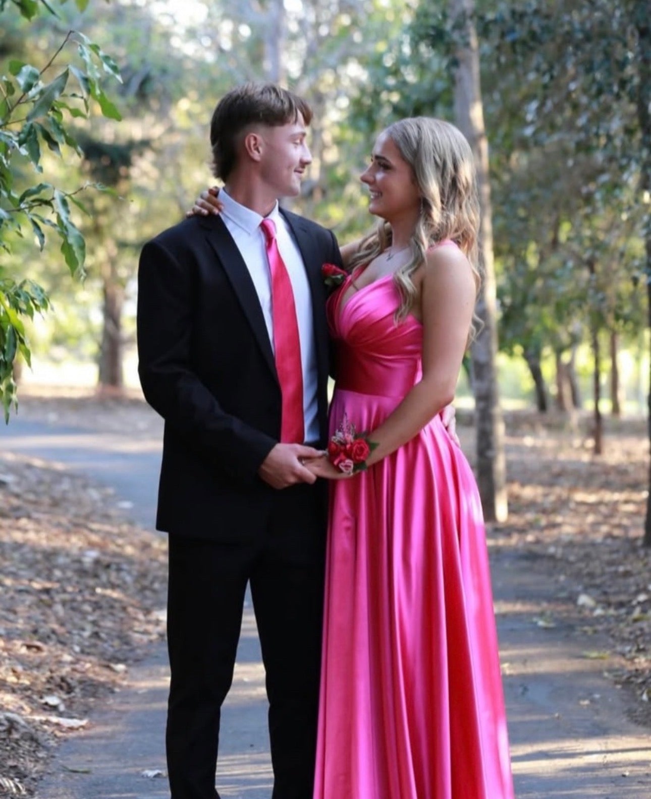Milly is wearing the Ava Satin Gown - Hot Pink - Size 8
