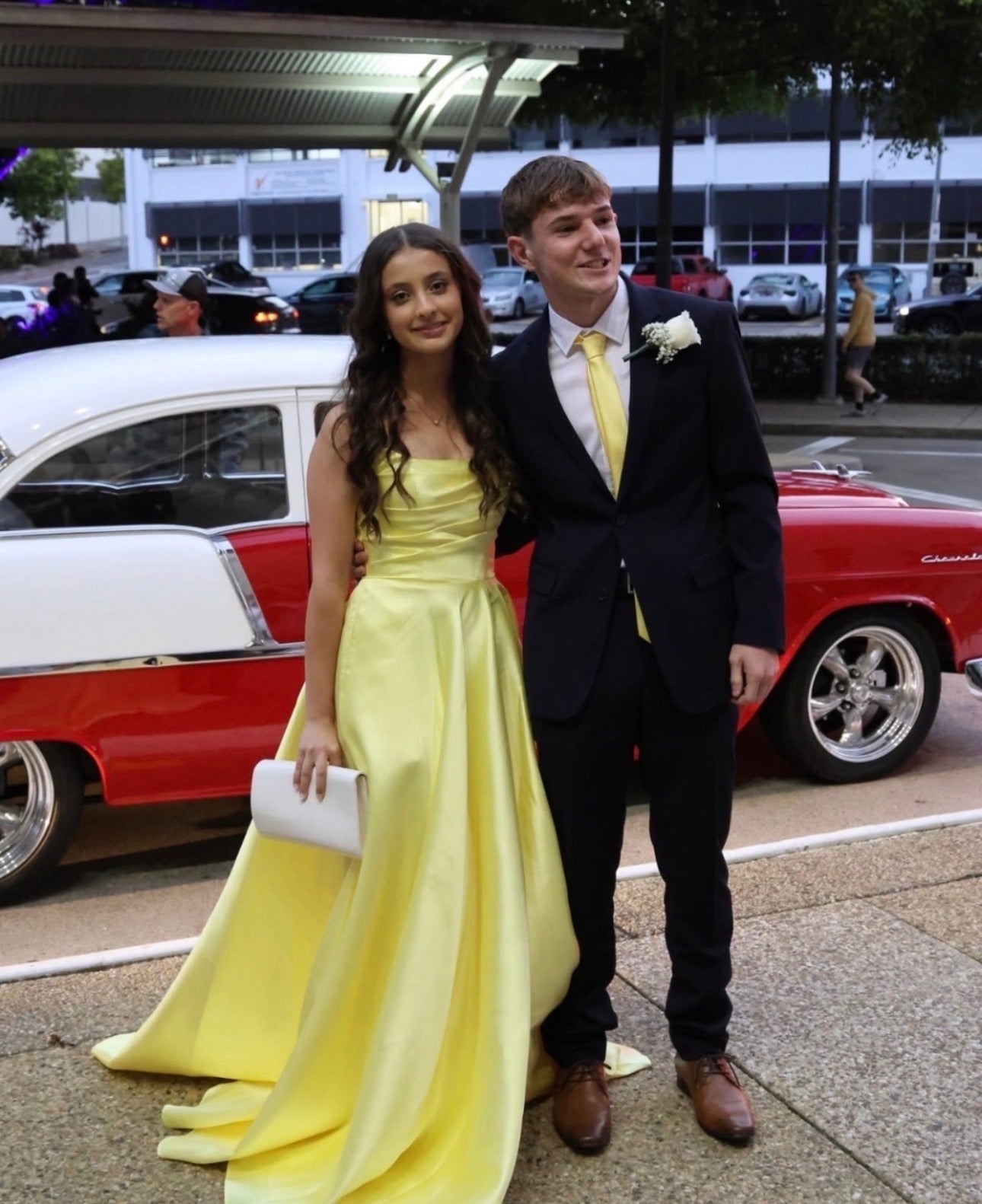 Madeline is wearing the Neveda Gown - Red - Size 6