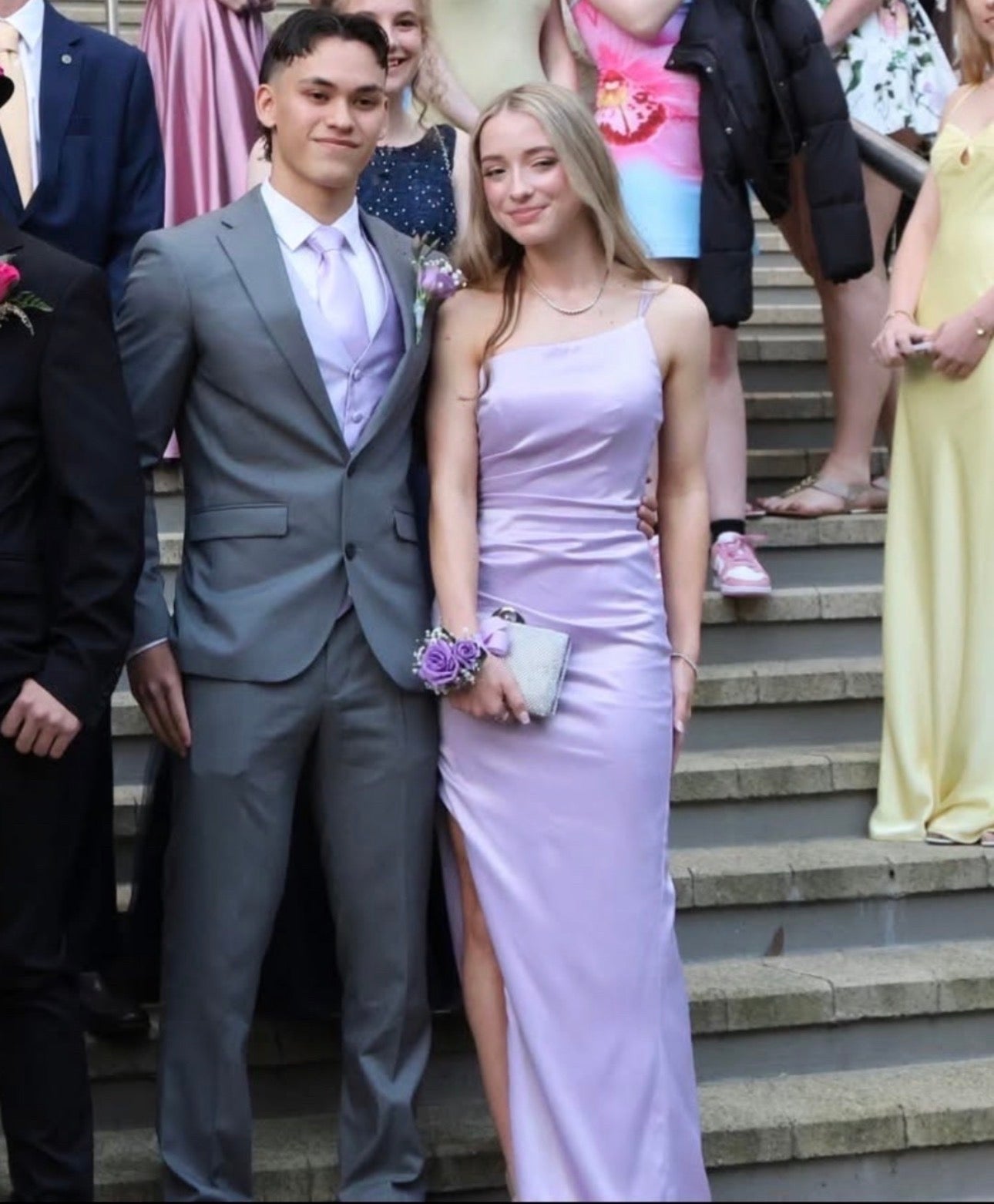 Zoe is wearing the Tayla Satin Gown - Lilac - Size 6