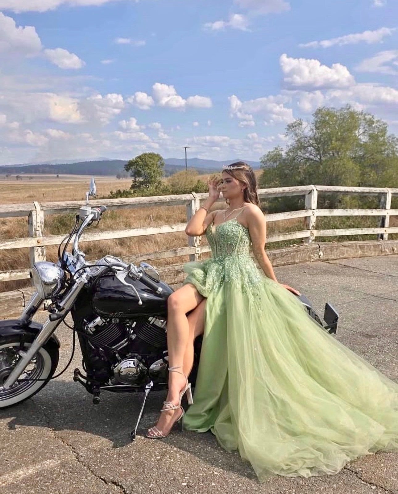 Angel is wearing the Morgana Corset Gown - Sage - Size 6