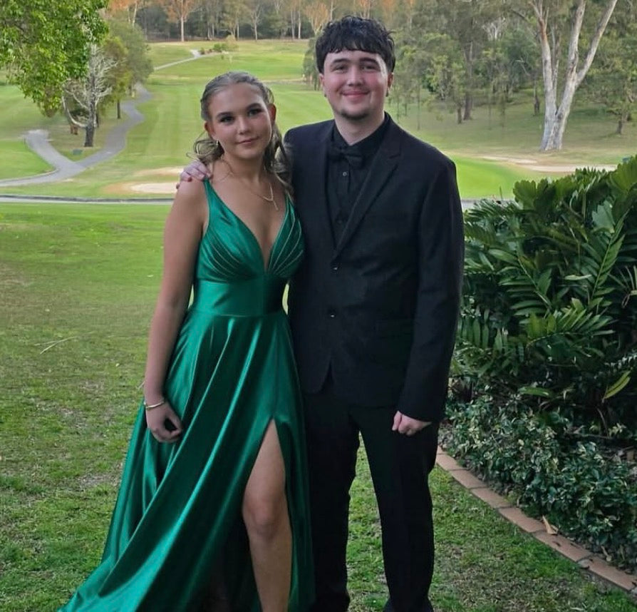 Madi is wearing the Ava Satin Gown - Emerald - Size 8