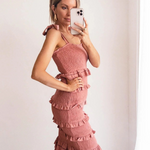 The Adele Midi Dress by Twosisters The Label is a lovely shirred midi dress with tiered ruffles and ribbon straps. With its square neckline and fishtail hem, you'll definitely have the silhouette of a walking mermaid. This dress has much stretch for women who want the best of both worlds - comfort and style! (pssst...also suitable for breastfeeding mummies).