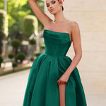 Complete your dream look with the Adelina Strapless Corset Gown. The Olive colour radiates elegance and sophistication. The strapless design and boned corset will accentuate your figure, while the full skirt and leg slit offer a touch of glamour. Perfect for any special occasion, this gown exudes luxury and exclusivity. Made of luxurious Mikado fabric.