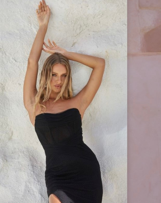 Look stunning in our Amanda Corset Beaded Mesh Gown! Delicately crafted with beaded mesh fabric and a corset for added structure, you'll be sure to turn heads. With a leg slit and slimming silhouette, you'll be ready to make a statement at your next event.