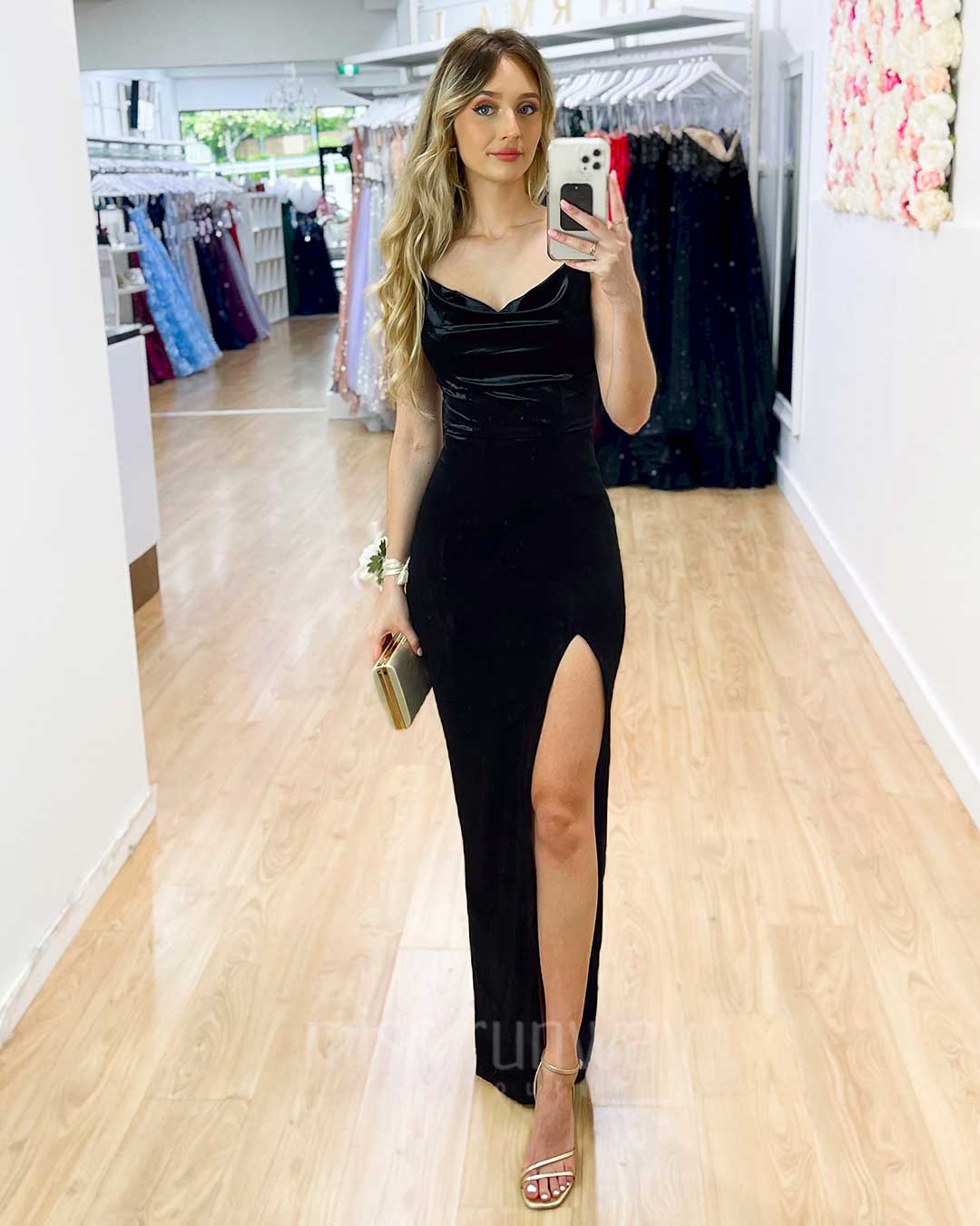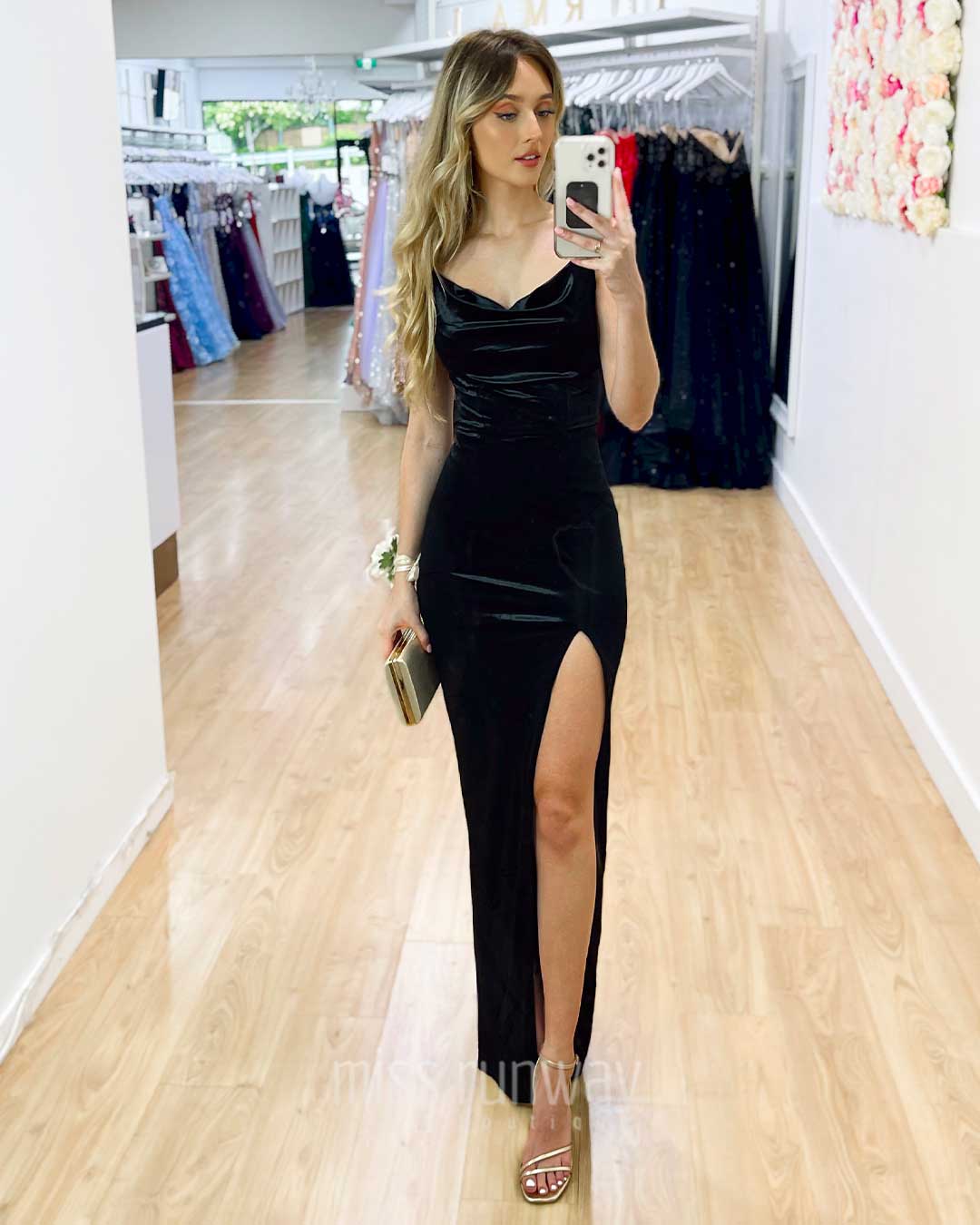 Don't just dream...live the fantasy in our Andrea Velvet Gown. The stretch of velvet fabric will hug your hips and its elegant cowl neck further flatters your curves. The front slit will surely enchant those around you.