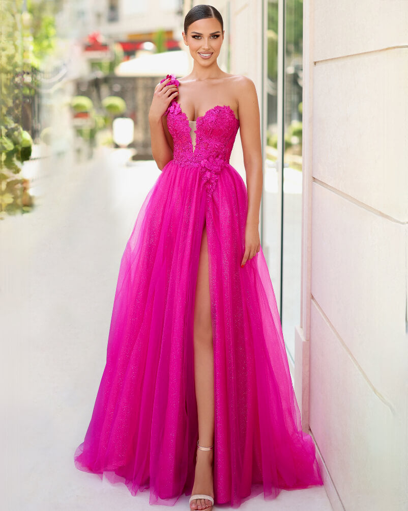 Make a statement in this luxurious Ariella One Shoulder Gown. With its elegant one-shoulder design, full ball gown skirt, and fitted bodice, this gown exudes sophistication and exclusivity. Adorned with delicate floral lace applique, it's the perfect choice for any special occasion. Elevate your style and be the center of attention with this stunning gown.