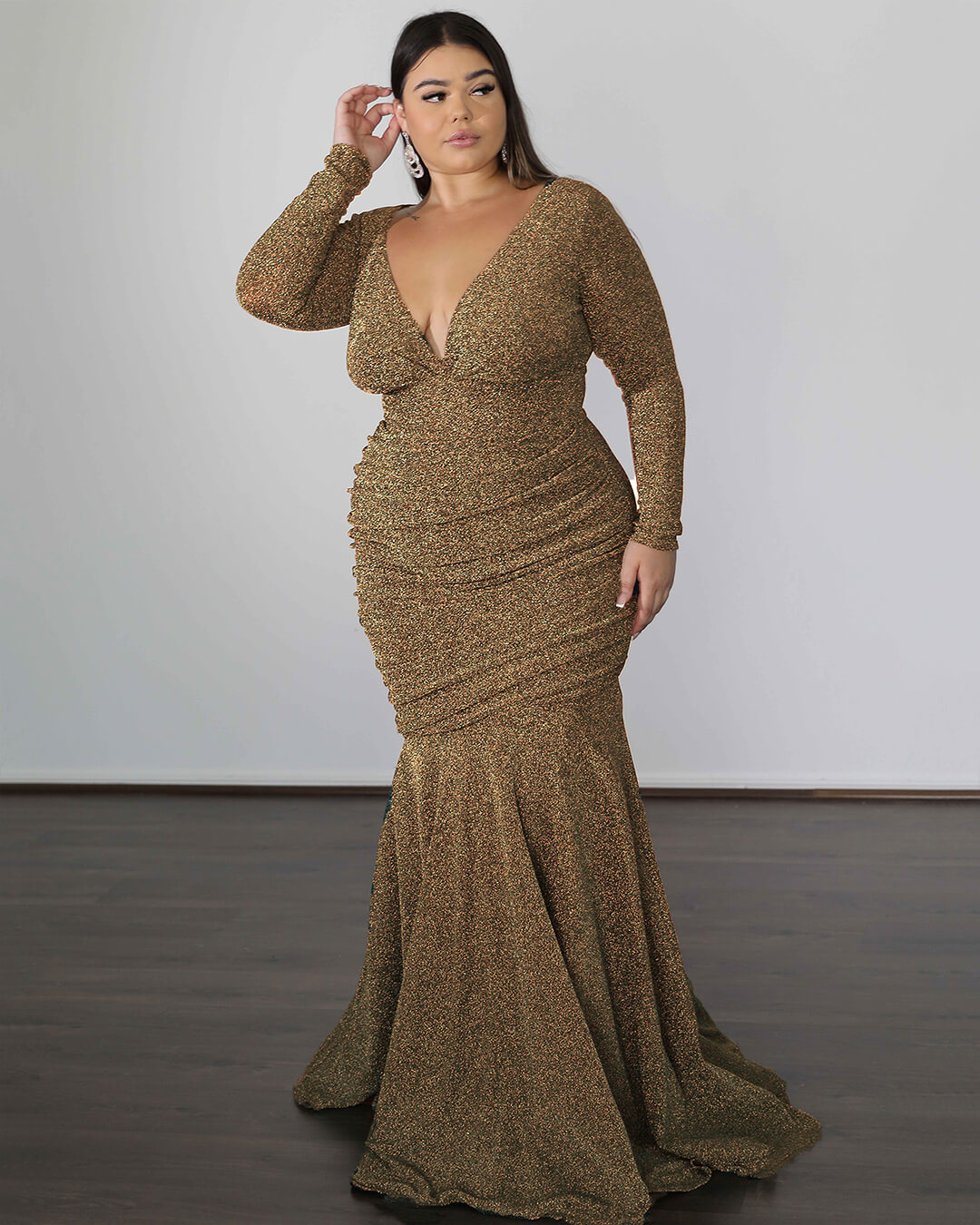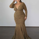 An unmistakable elegances, our ‘Ashley’ metallic jersey formal gown features a wide v-neckline, ruched gathered skirt, and a silhouette designed to flaunt your curves.
