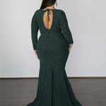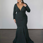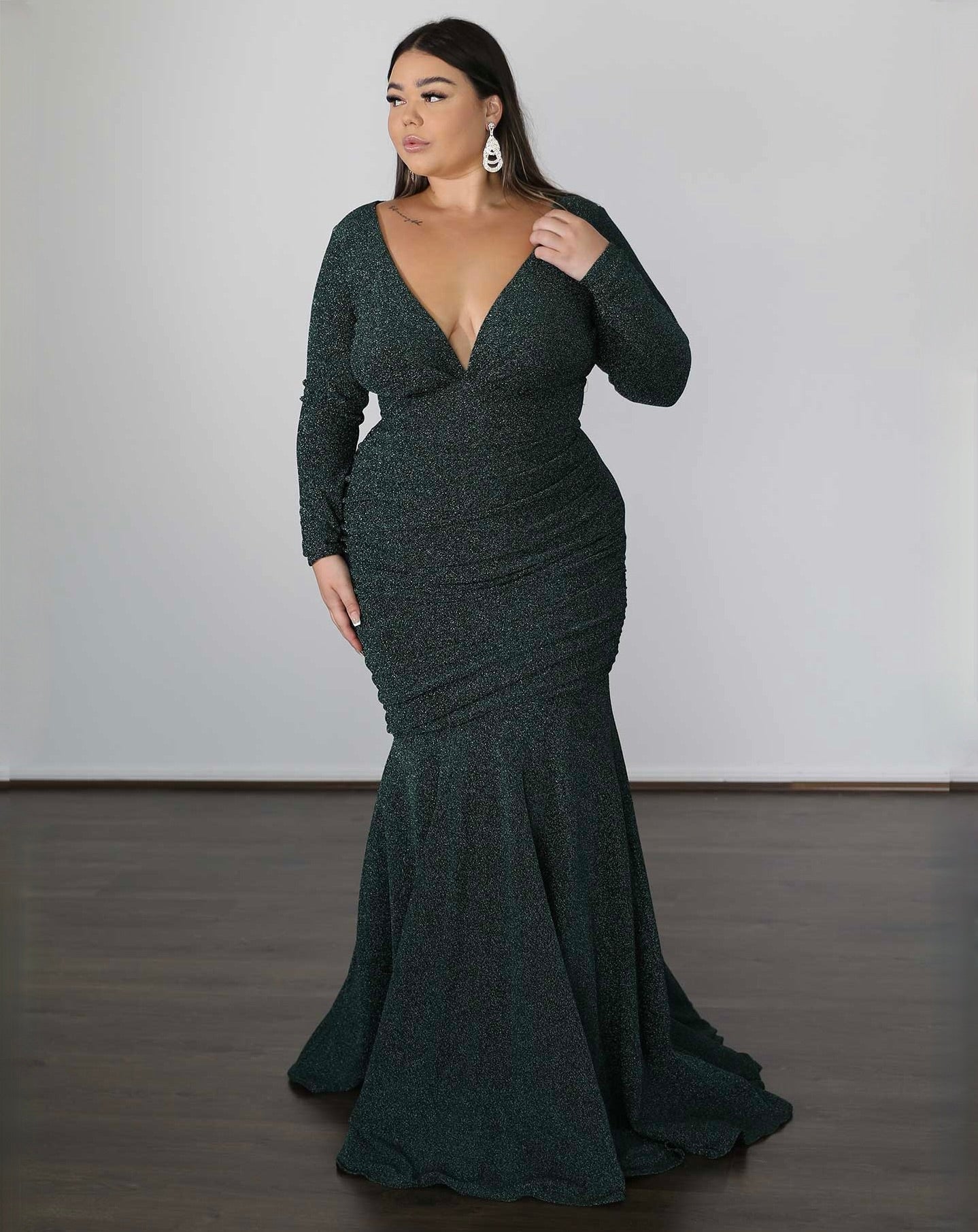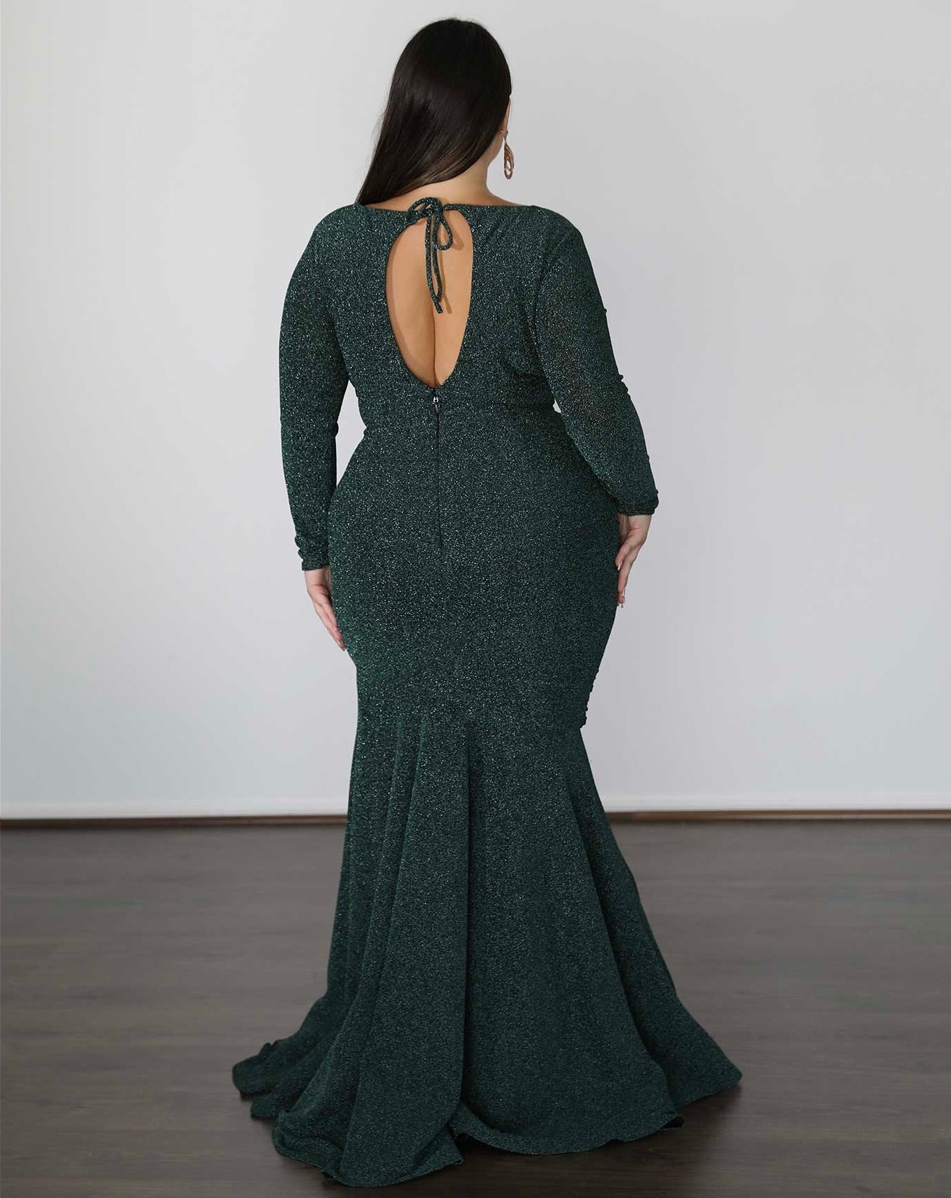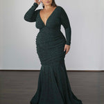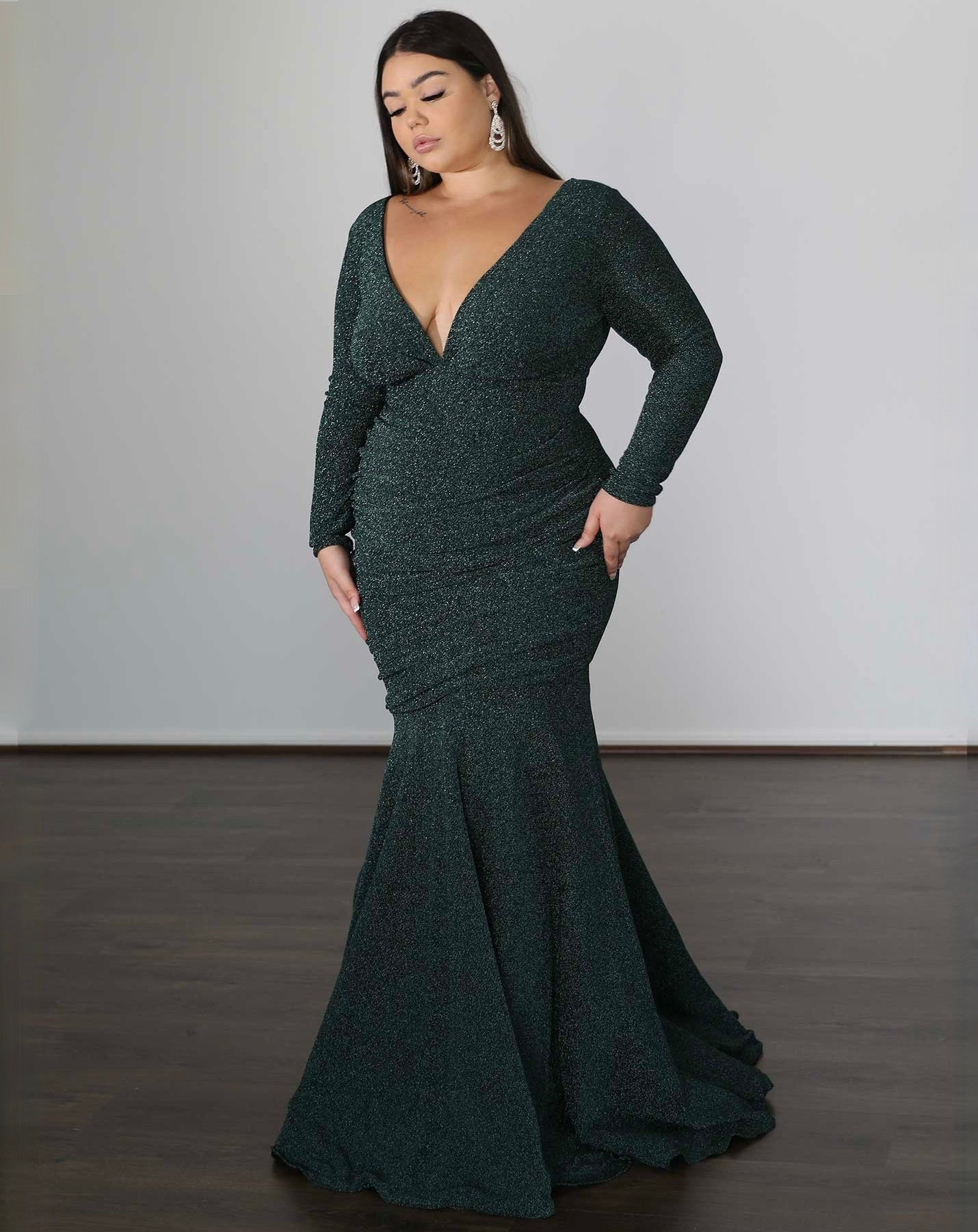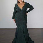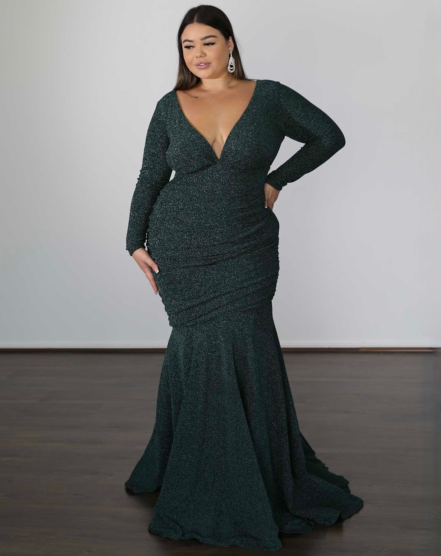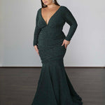 An unmistakable elegances, our ‘Ashley’ metallic jersey formal gown features a wide v-neckline, ruched gathered skirt, and a silhouette designed to flaunt your curves.