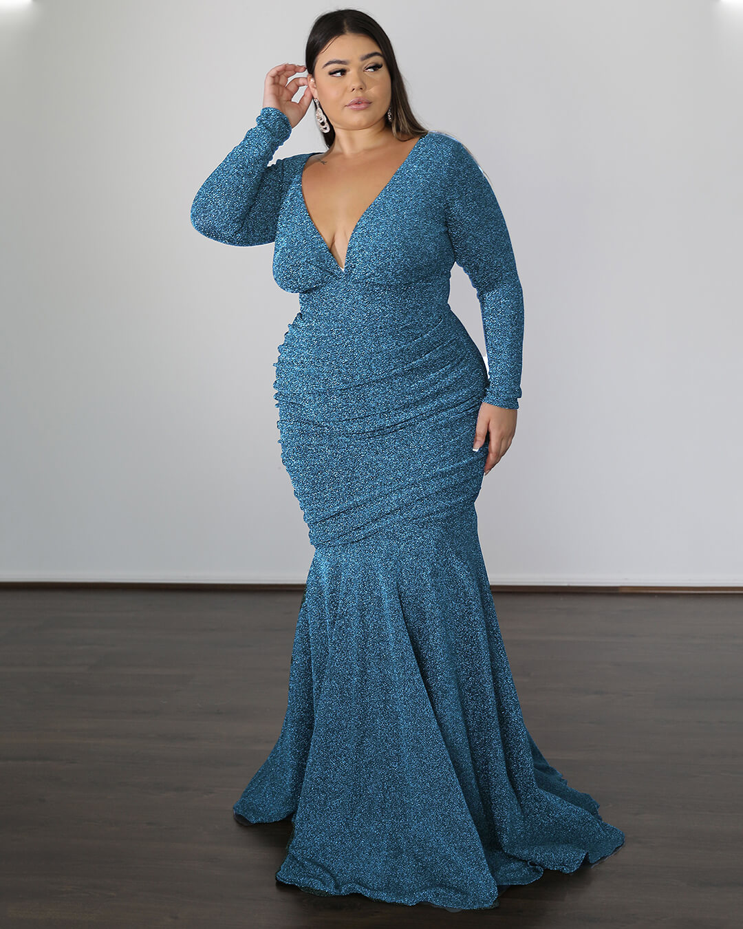 An unmistakable elegances, our ‘Ashley’ metallic jersey formal gown features a wide v-neckline, ruched gathered skirt, and a silhouette designed to flaunt your curves.