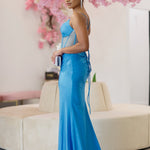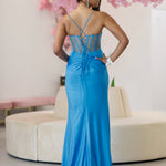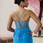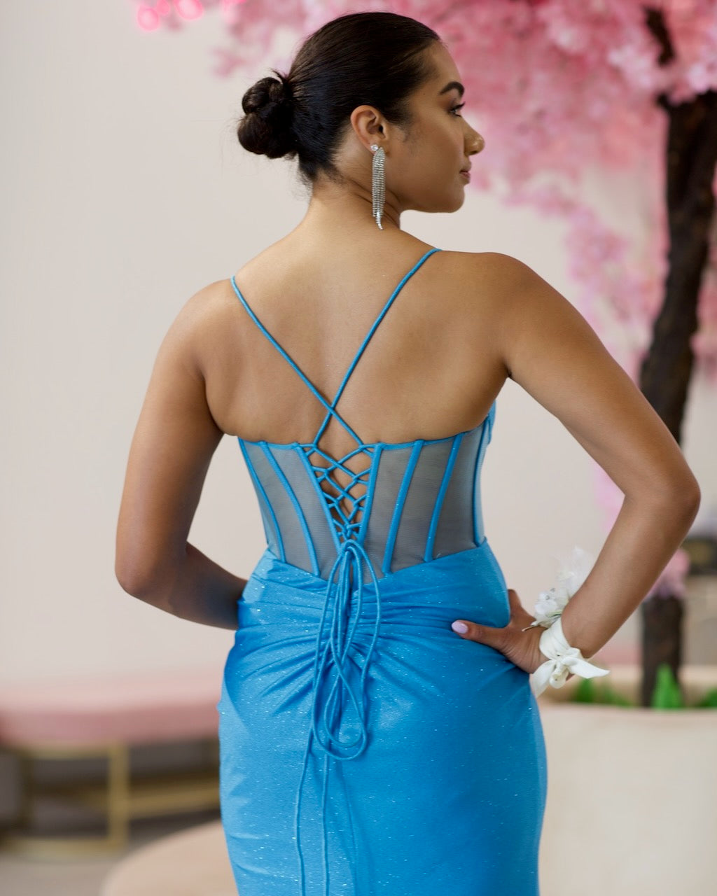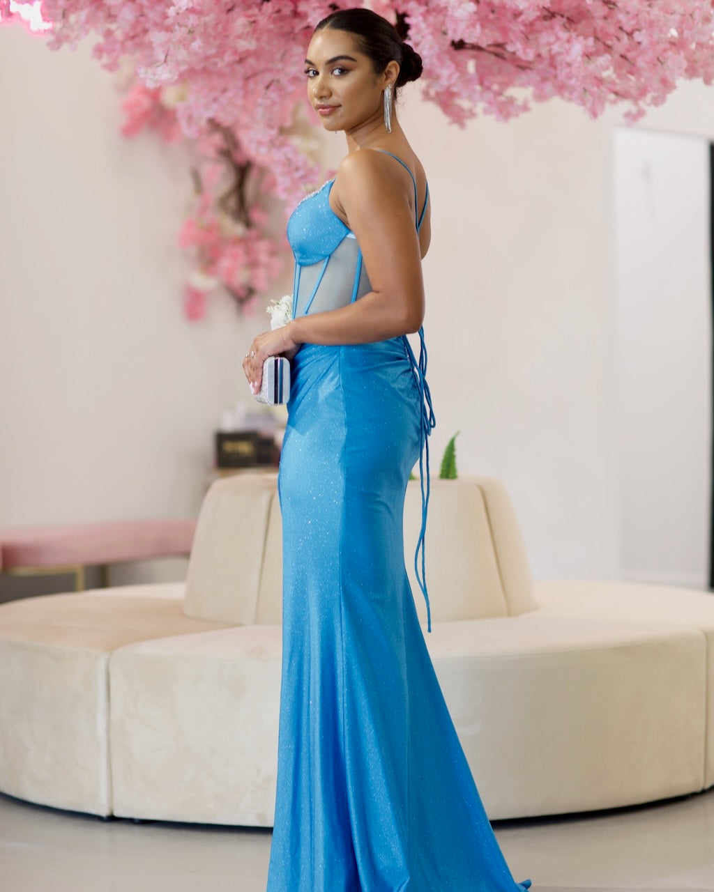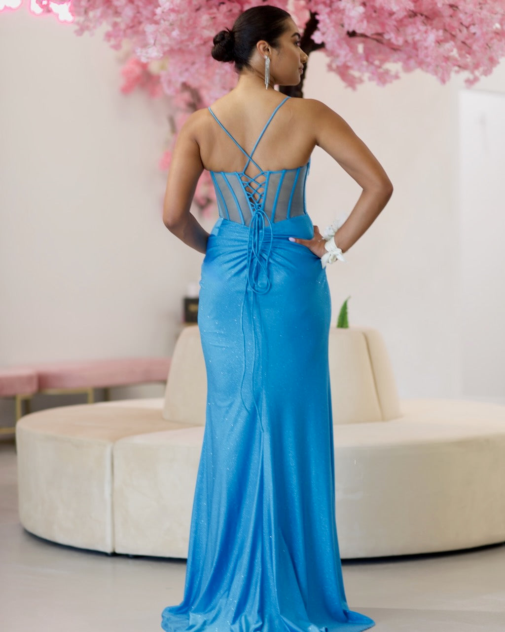 Indulge in elegance with the Aurielle Glitter Corset Gown. This exquisite gown boasts a sheer boned bodice adorned with crystal appliqué, a gathered waistline for a flattering silhouette, and a daring leg slit. Made from shimmering glitter fabric, this gown is the epitome of luxury.