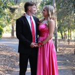 Our Ava Satin Gown is simple and elegant with a side of sexy and sparkle. The V-neckline and thick under-bust band compliment all body types. The flowy skirt hides a sneaky thigh high slit to give this dress that extra bit of oomph! You'll be strutting all night long in this stunning gown.