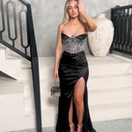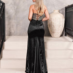 Elevate your allure in our Avery Satin Corset Gown, a timeless piece that effortlessly blends sophistication with a touch of drama. The silver beaded corset-like waist design adds a touch of glamour, cinching at the waist to create a captivating silhouette. The gathered hip line enhances your curves with subtle playfulness, while the leg slit adds a hint of allure, allowing you to dance with confidence. The lace-up corset back not only guarantees a perfect fit but also infuses a touch of romance into this enchanting ensemble. This dress is a celebration of your magnetic charm and refined style, ensuring you stand out at any special occasion. Step into this black beauty and let your elegance shine, leaving a trail of admiration wherever you go.