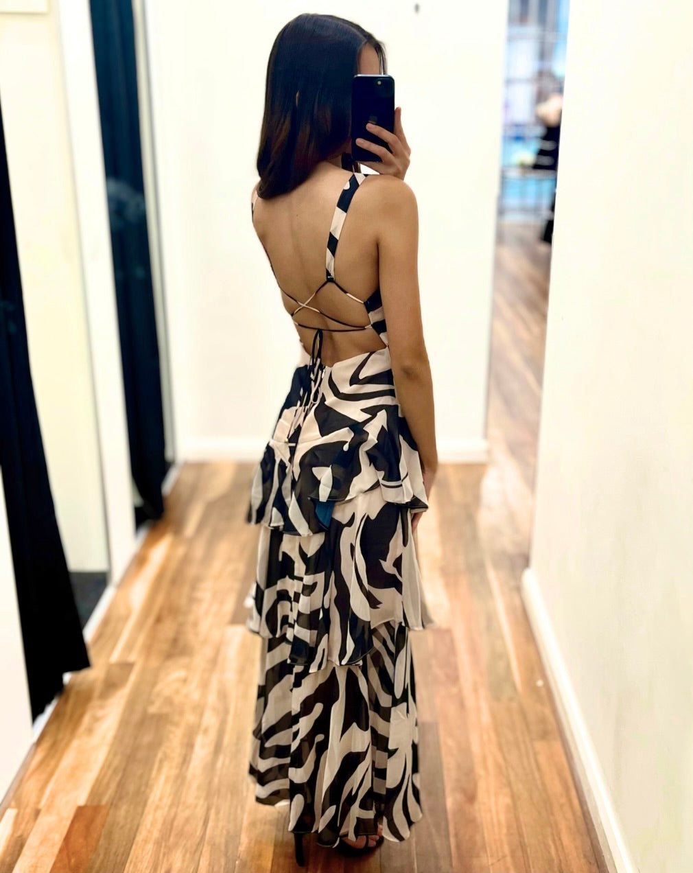 Indulge your sense of style in our exquisite Bella Layered Chiffon Maxi Dress. Crafted from luxuriously soft chiffon, this dress features a deep neckline, a lace-up back, and a layered skirt that flows gracefully to maxi-length. Perfect for a special occasion, this dress is sure to make a statement.