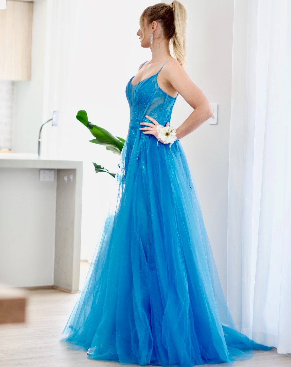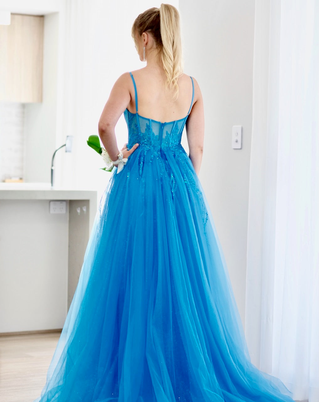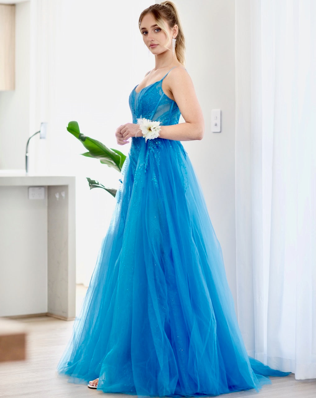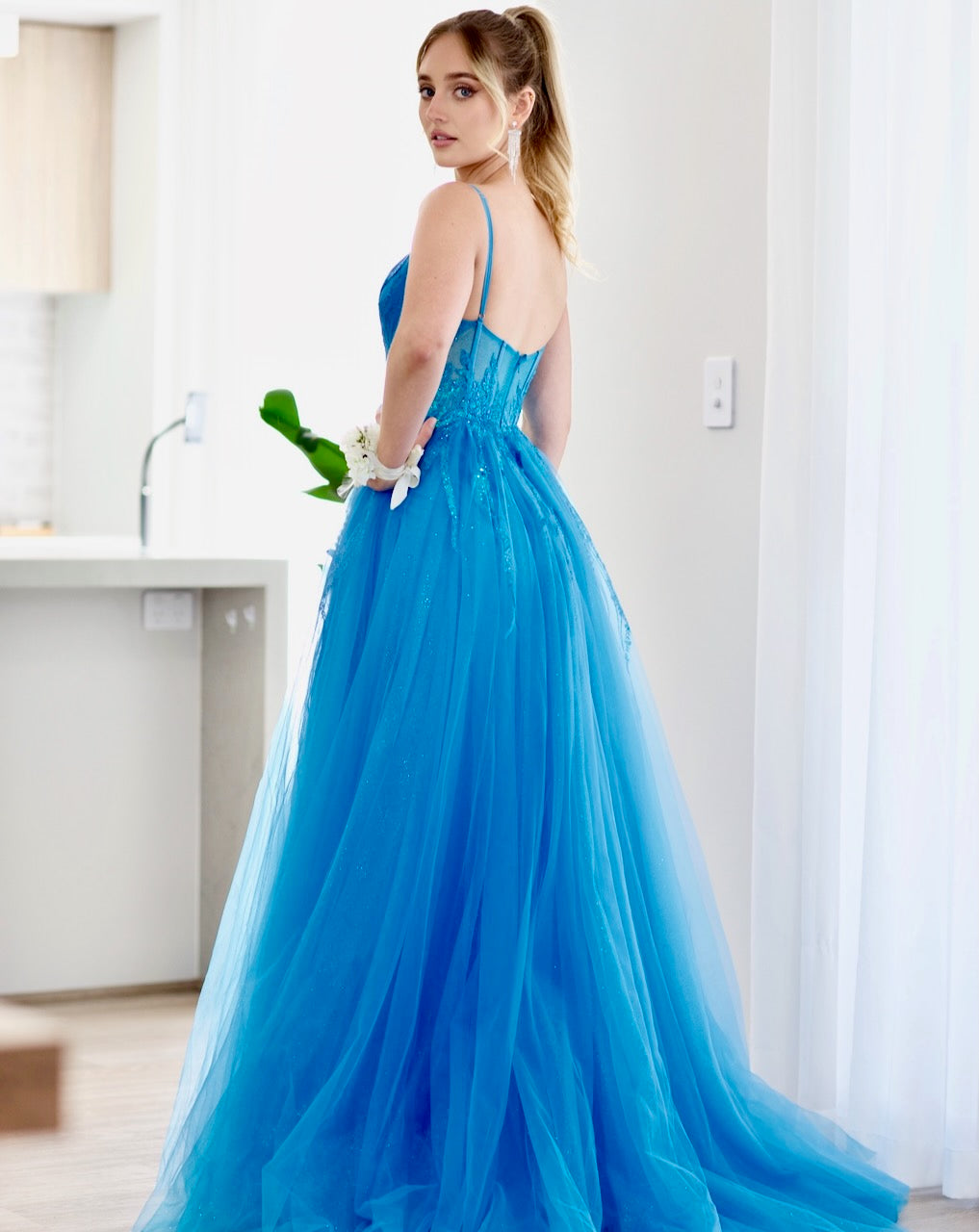 A scoop neckline and spaghetti straps frame the top of the enchanting Birdie Corset Lace Gown, leading to a bodice graced with sequin motif details. A dramatic tulle overlay brings a whimsical and romantic air to the overall design.
