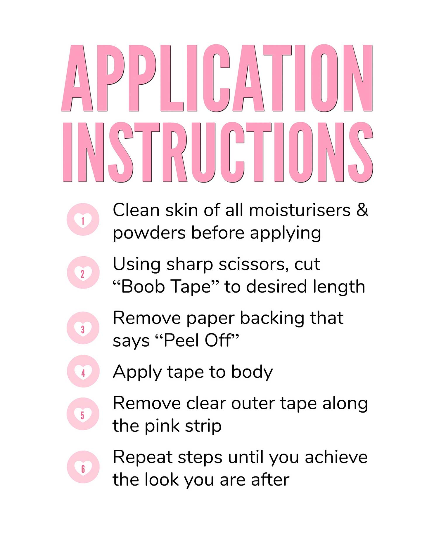 Using Boob Tape • Clean skin of all moisturisers & powders before applying • Don’t apply over broken, damaged or sun-burned skin • Remove Boob Tape gently & slowly • Soak Boob Tape off in warm water for easy removal • Discontinue use immediately if redness or irritation occurs • Pre-test for sensitivity or allergies