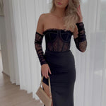 The new sexy Brigitte Strapless Corset Gown by Nicoletta features mermaid style, strapless corset bodice, detachable long sleeves and a leg split. Feel like a movie star!
