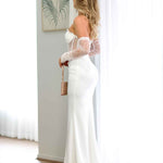 The new sexy Brigitte Strapless Corset Gown by Nicoletta features mermaid style, strapless corset bodice, detachable long sleeves and a leg split. Feel like a movie star!