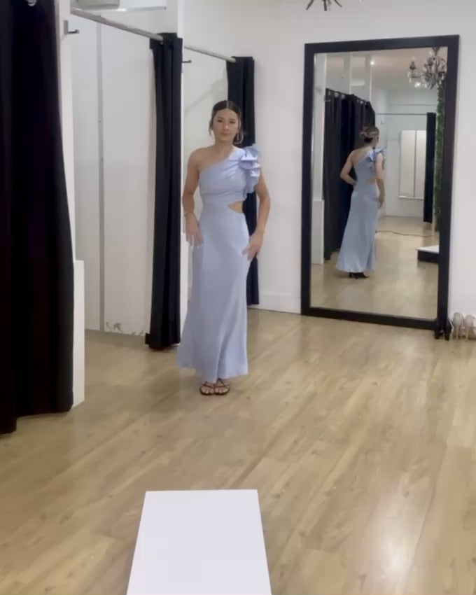 The Cassia Maxi Dress combines elegance with modern design. Featuring a sophisticated one-shoulder silhouette enhanced by delicate frill detailing, this dress offers a graceful statement. A subtle side cut-out adds a hint of allure, perfect for evenings when you want to captivate with refined style.