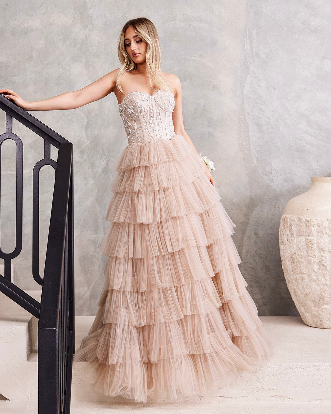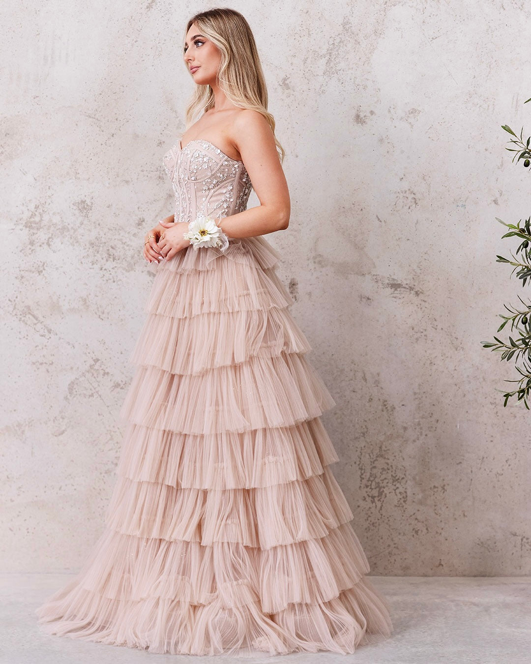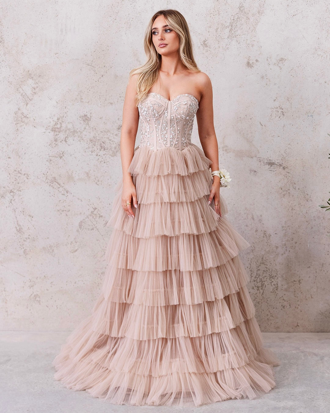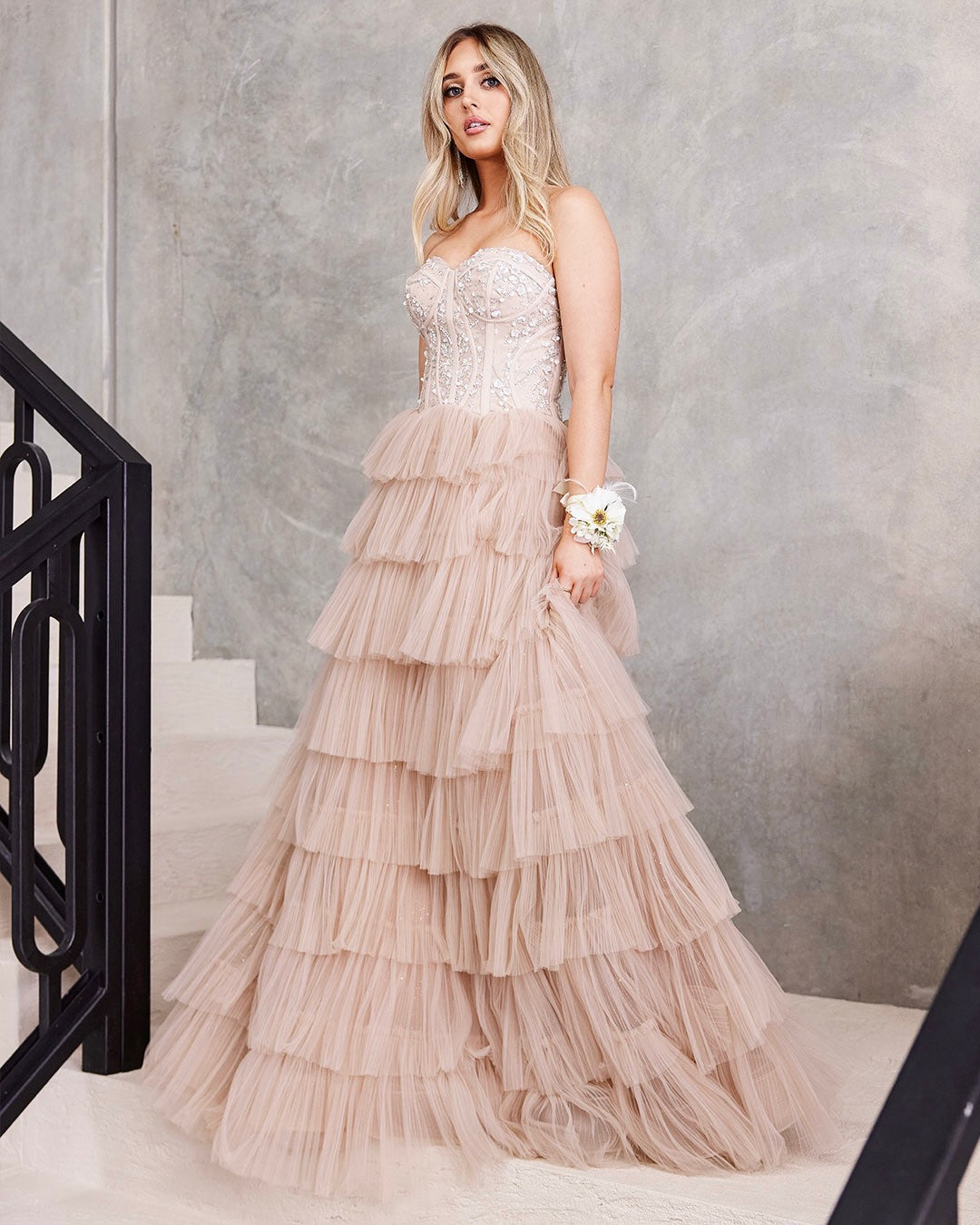 The new beautiful Celeste Layered Strapless Ball Gown features a strapless corset bodice adorned with luxurious embroidery, and a layered tulle skirt, this dress will have you radiating with regal princess vibes. Let your inner royalty shine with this classic and beautiful gown.