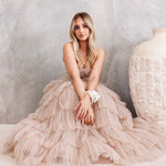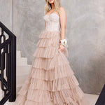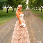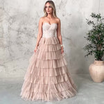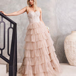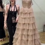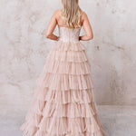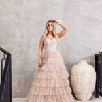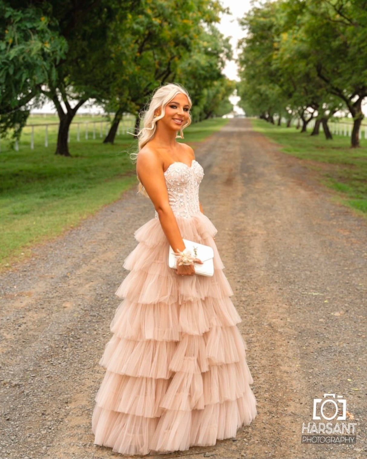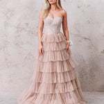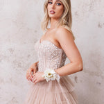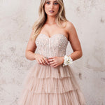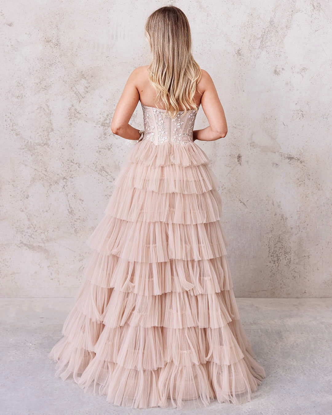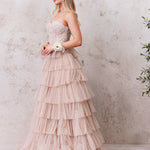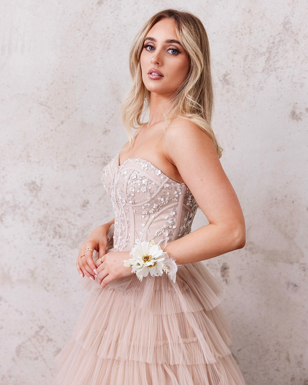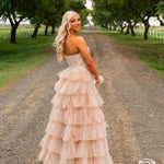 The new beautiful Celeste Layered Strapless Ball Gown features a strapless corset bodice adorned with luxurious embroidery, and a layered tulle skirt, this dress will have you radiating with regal princess vibes. Let your inner royalty shine with this classic and beautiful gown.
