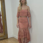 Party season is in full swing, whether it be a day at the races, a fancy birthday party or just a excuse to get dolled up, we have the perfect outfit just for you. The amazing Celine Lace Set will be the envy of all your friends. Stunning off shoulder design crop top with cute short sleeves and matching half lined midi length high low skirt makes this outfit a stand out.
