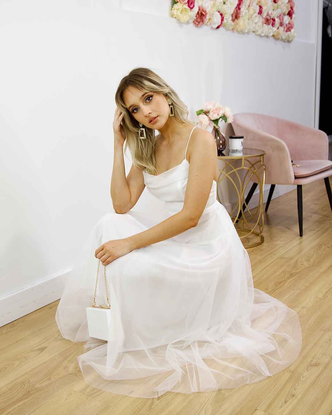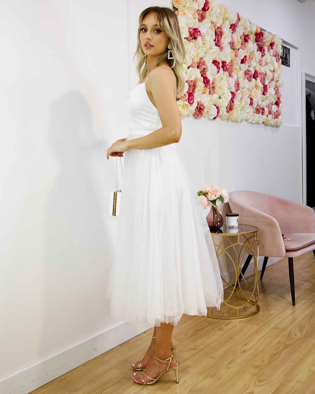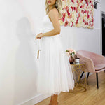 The new Charlotte Midi Dress is so special. Similar to our best seller Carrie Midi Dress, features midi length, Cowl neck, tulle and lace up back. Be ready to feel like a princess!