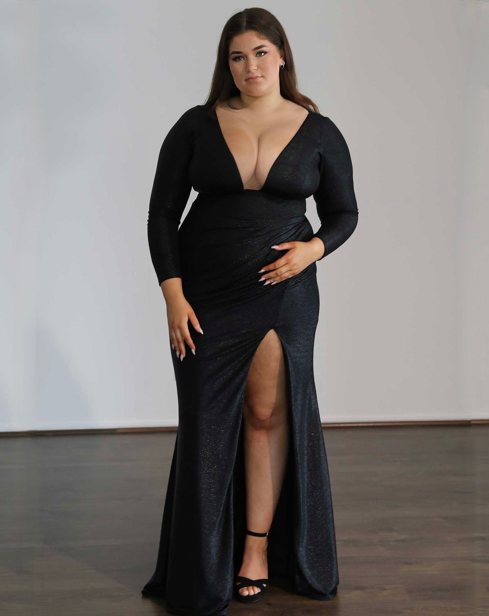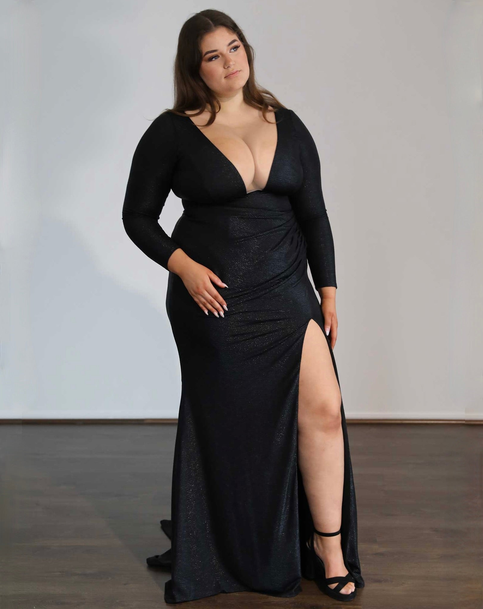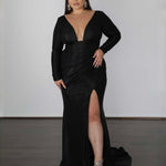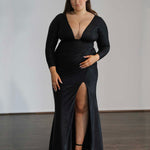 Made from our opulent stretch shimmer material, our 'Chelsea' flaunts a daring neckline, gathered skirt, and chic skirt slit for the ultimate formal vibe.