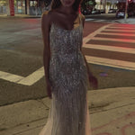 Turn heads and make a statement in this stunning Clementine Beaded Fringe Gown. This beautiful gown is perfect for evenings spent dancing, special occasions, or grand entrances. Its fitted mermaid silhouette gives it an exquisite hourglass shape that will make you feel both glamorous and sophisticated. The gorgeous silver embellished tulle overlay ensures sparkle while the nude lining underlines your figure. Further embellishments adorn the scoop neckline with thin straps, while dangling fringe rhinestone details add a glimmer of light to your look. This glamorous gown is sure to have all eyes on you every time you enter the room for the ultimate impactful entrance!