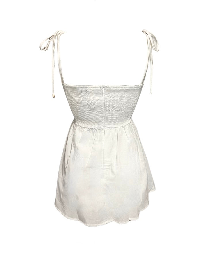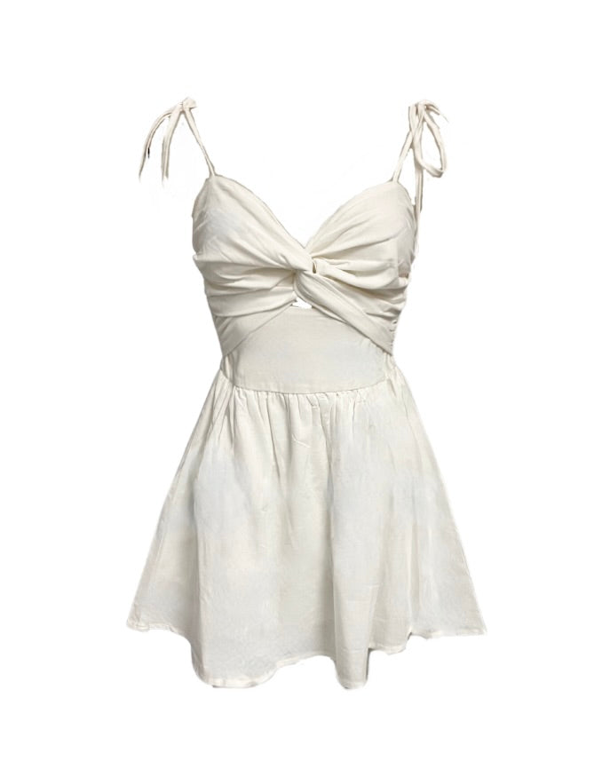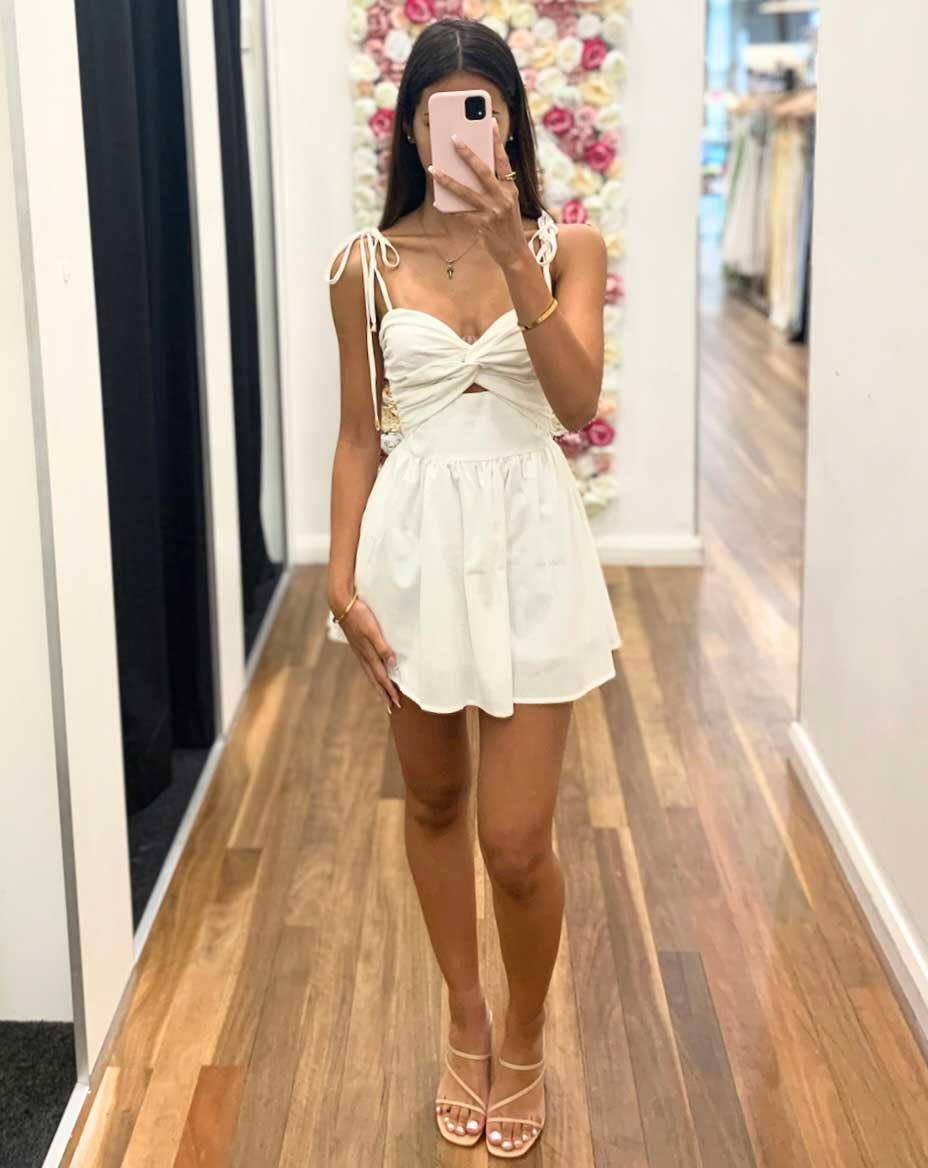 Please meet our new addiction of this season: The Dominique Maxi Dress. Featuring lace up straps, mini length and a cute open belly detail.