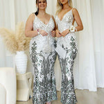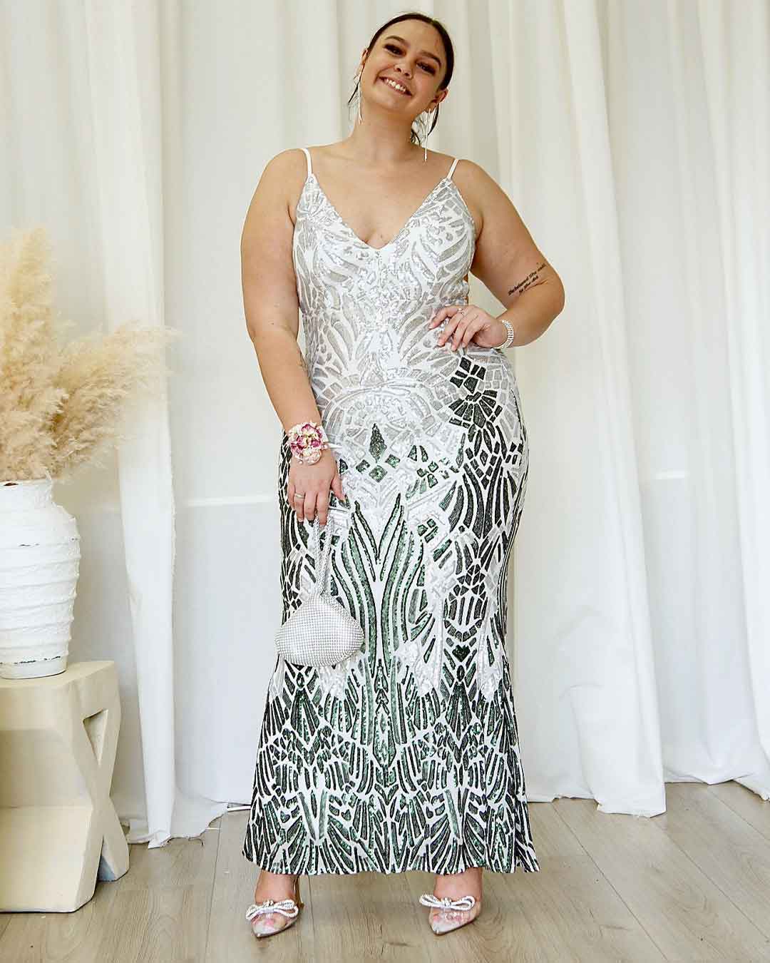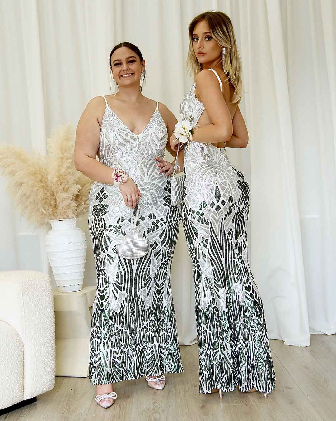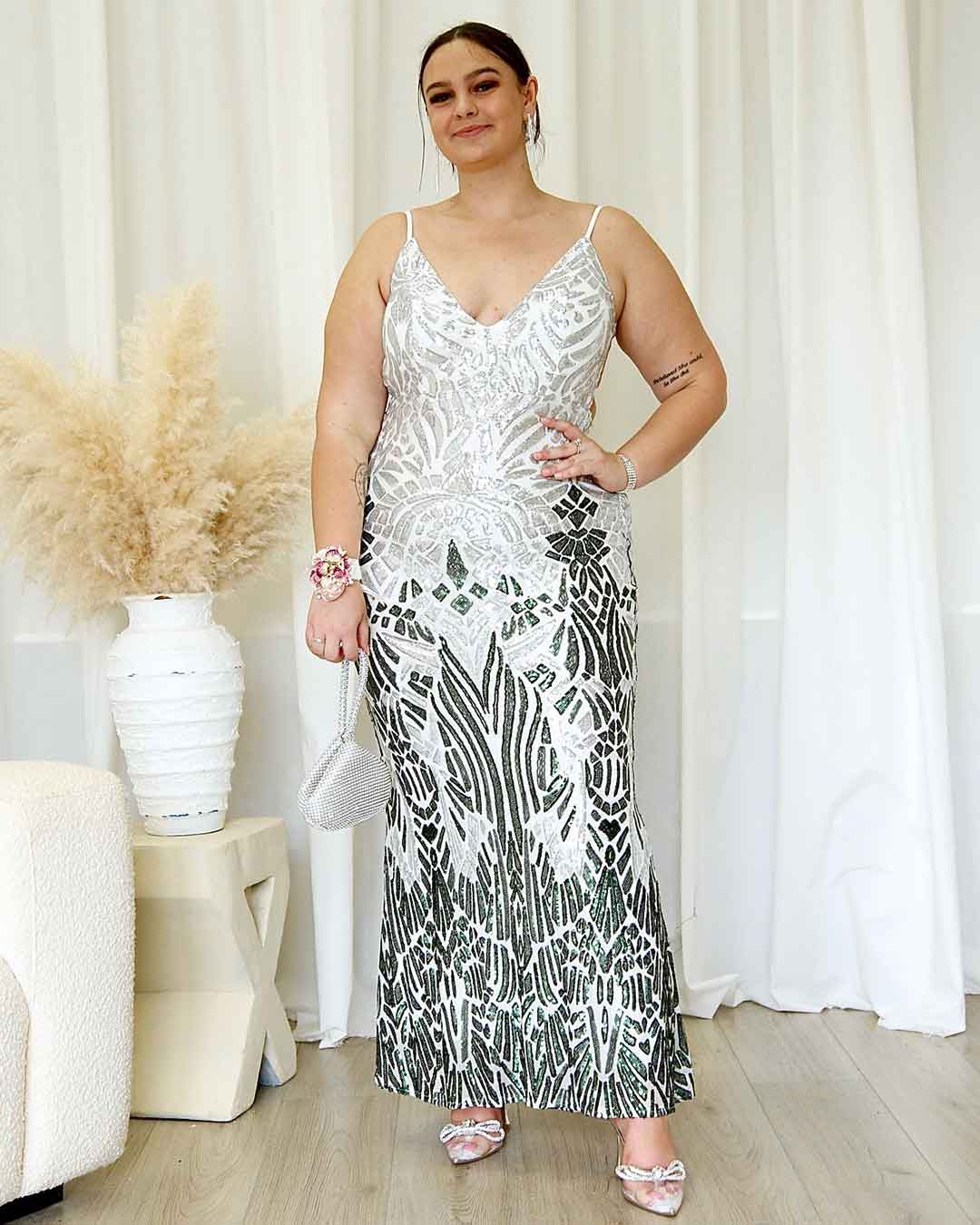Look no further than our Elsa Sequin Gown for a showstopper. No matter what the event, you'll look captivating in this gorgeous pattern sequin gown with the striking combo of a plunging and open back.