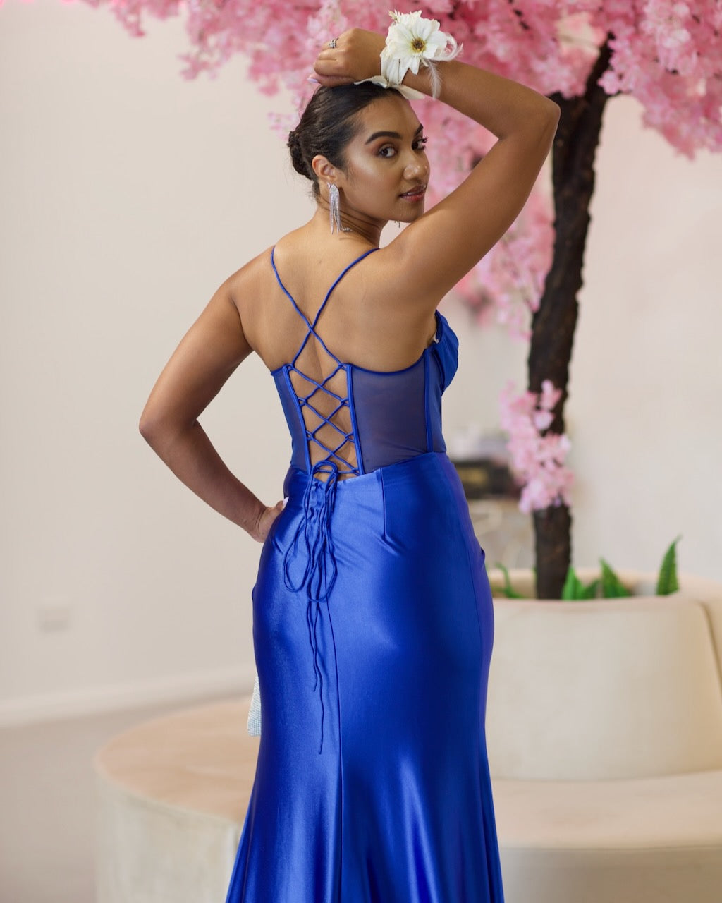 Show off your best features with the stunning Emeline Satin Corset Gown! Crafted from the luxe satin, this exquisite gown clings to your figure and provides a tantalisingly glamorous look. The sheer boned bodice is detailed with elegant pleats, crystal beading, and a gathered waistline that flatters every inch of you. For an added touch of drama, the leg slit catches the eye, while the lace up corset back helps to show off your beautiful silhouette. Perfect for prom night or other special occasions, you will be sure to turn heads in this deliciously sexy corset satin gown.