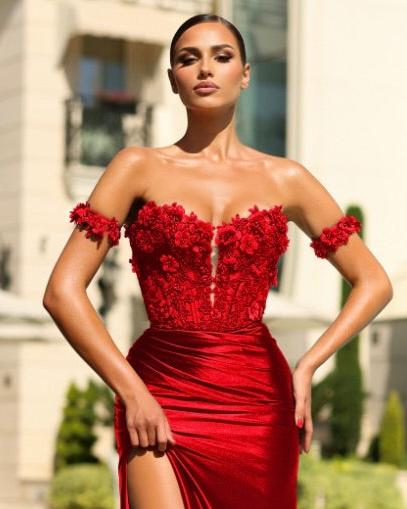 Turn heads in the breathtaking Faith Off Shoulder Corset Gown, crafted from luxurious silky satin fabric. This gown features an off-the-shoulder design with elegant detachable sleeves, offering versatility and timeless charm. The structured corset bodice enhances your silhouette, while delicate floral embroidered appliqué adds a touch of romance. The figure-hugging mermaid silhouette, paired with a daring high leg slit, creates an unforgettable look, perfect for making a statement at any special event.