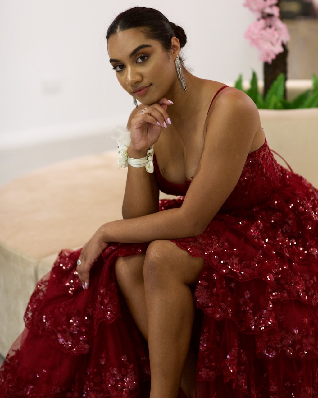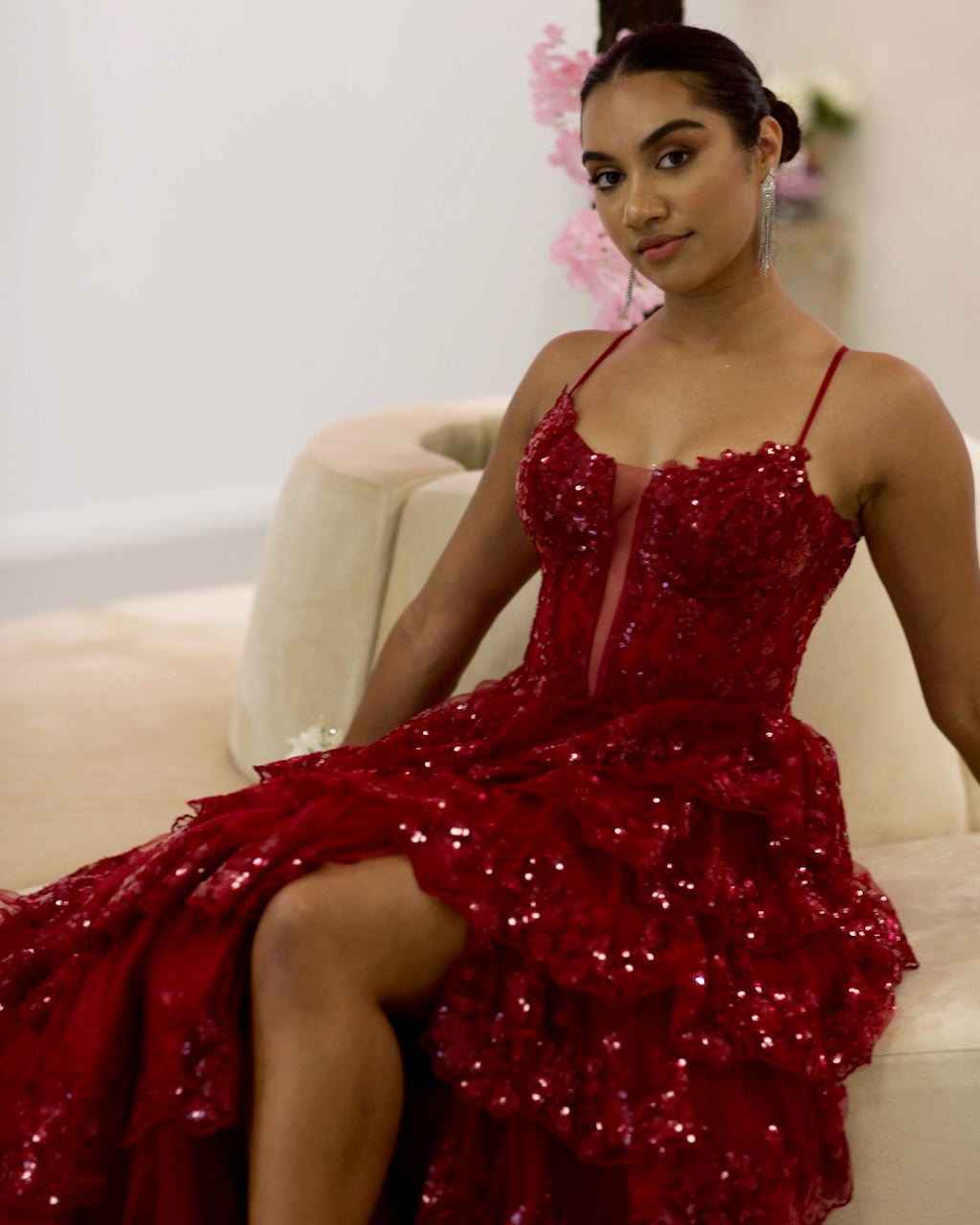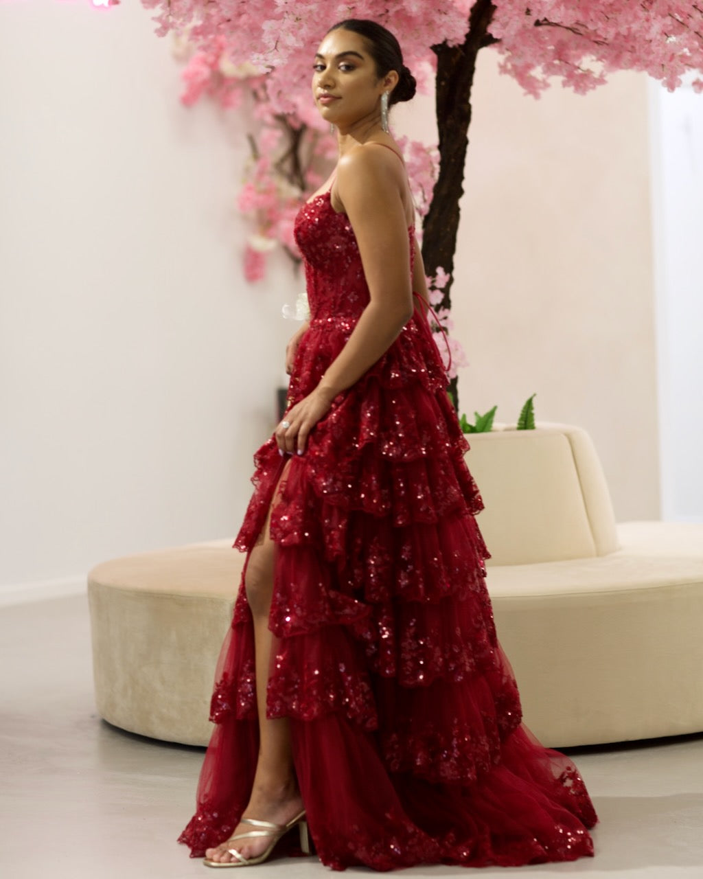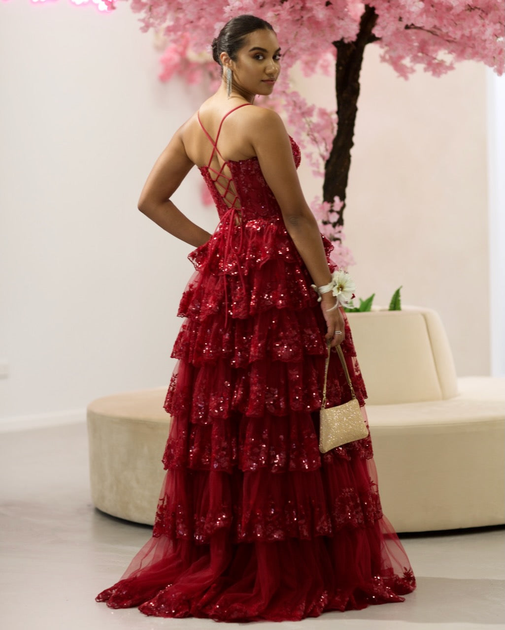 Step into a world of romance with our Felicia Ruffle Gown, a dreamy creation that blends elegance and charm. The flowing tiered skirt, trimmed with sparkling scalloped lace, gracefully hides a subtle leg slit. The sheer, boned bodice glimmers with sequins, while the lace-up corset back adds both allure and a perfect fit. Every detail of this gown shines, making it a timeless choice for those seeking to captivate with style and grace.
