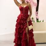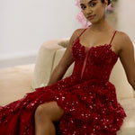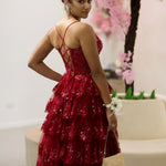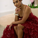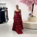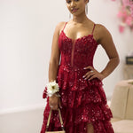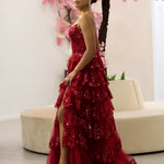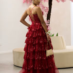 Step into a world of romance with our Felicia Ruffle Gown, a dreamy creation that blends elegance and charm. The flowing tiered skirt, trimmed with sparkling scalloped lace, gracefully hides a subtle leg slit. The sheer, boned bodice glimmers with sequins, while the lace-up corset back adds both allure and a perfect fit. Every detail of this gown shines, making it a timeless choice for those seeking to captivate with style and grace.