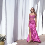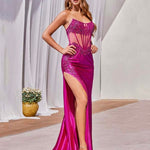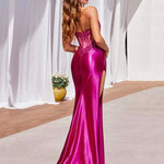 Introducing the ultimate statement-making piece that will have heads turning and hearts racing. The Francesca Strapless Lace Satin Gown is designed to make you feel like royalty, with its alluring features and luxurious materials. This dress boasts a fitted silhouette that accentuates your curves in all the right places. Prepare to feel like a goddess as the satin fabrication glides over your body, creating a smooth and sumptuous experience that will leave you feeling absolutely divine. The scoop neckline adds a touch of sophistication, framing your décolletage and drawing attention to your radiant face. A sheer boned bodice tantalizes with a hint of sensuality. But that's not all - we've thoughtfully included a side leg slit that offers a glimpse of your enchanting legs with each step you take. Adding to the allure and charm of this dress, delicate lace embellishments grace the bustline and waistline, creating a breathtaking focal point that captures attention and ignites curiosity. The intricate lace detailing provides an exquisite contrast against the smooth satin fabric, resulting in a mesmerizing masterpiece that is simply unforgettable. Prepare to leave a trail of awe and admiration in your wake as you dazzle in this satin beauty. Elevate your style, redefine elegance, and embrace the magic that only this dress can bring.