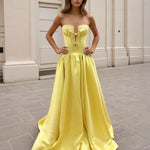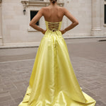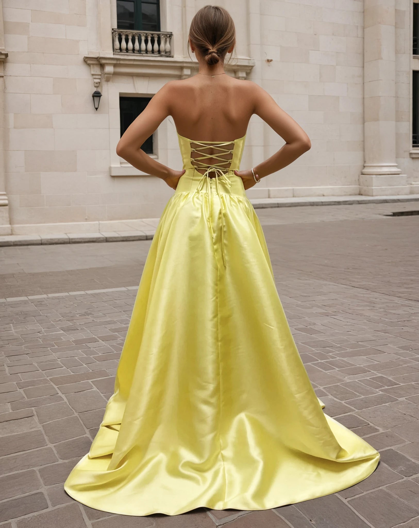 Indulge in timeless grandeur with the Gabrielle Strapless Bow Gown. Impeccably tailored in lustrous Mikado, this sculptural A-line silhouette radiates refined elegance. The structured bodice is adorned with two small bow details, artfully framing a graceful front split that adds just the right touch of allure. Intricate pleating flows into a voluminous skirt, while the lace-up back ensures a flawless, cinched-in fit. Fully lined for a seamless feel, this gown is designed for the woman who commands every room she enters.