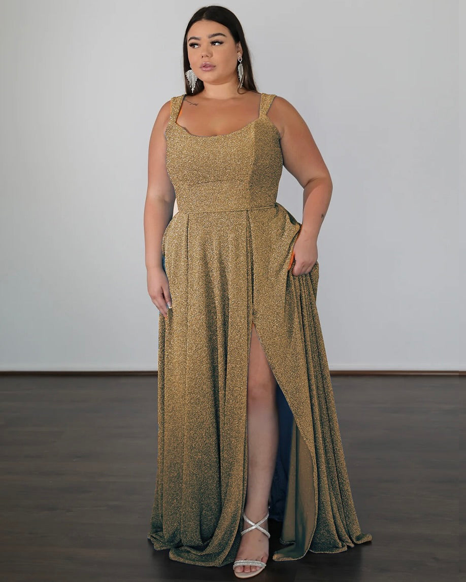 Stylish and sophisticated, meet the darling "Hayley" dress - the perfect combination of modern meets fairytale. Show off those trendy tapered shoulder straps, pose with the dramatic thigh high split, and feel like royalty with the full princess-style skirt.