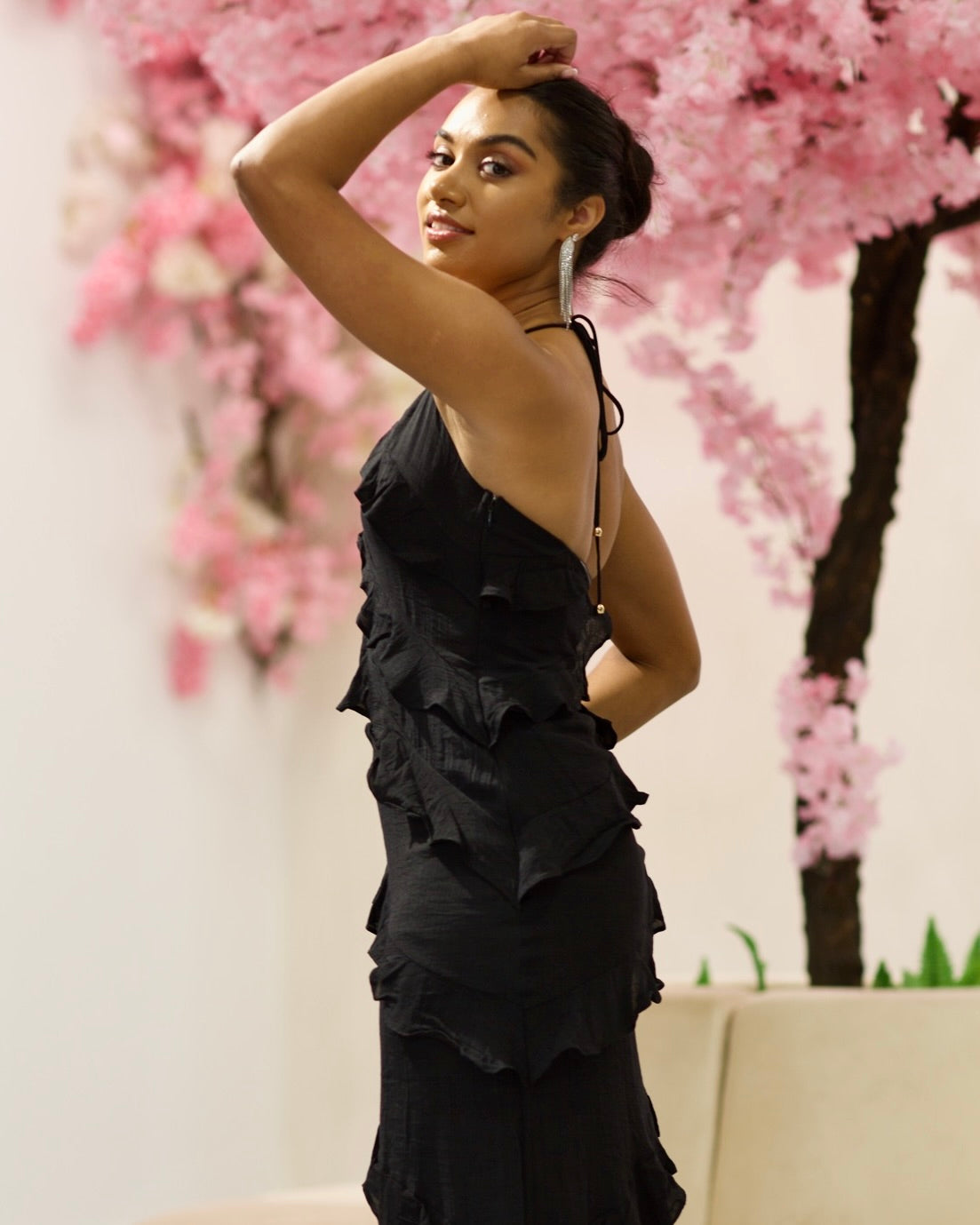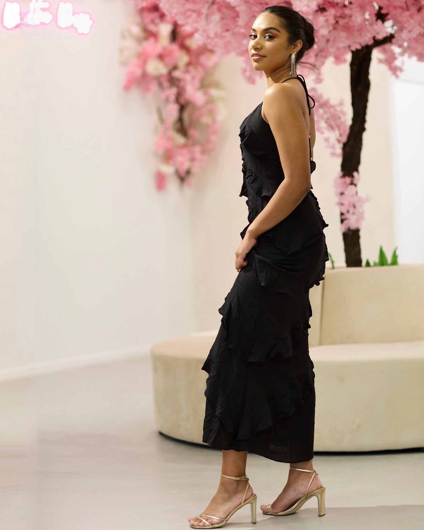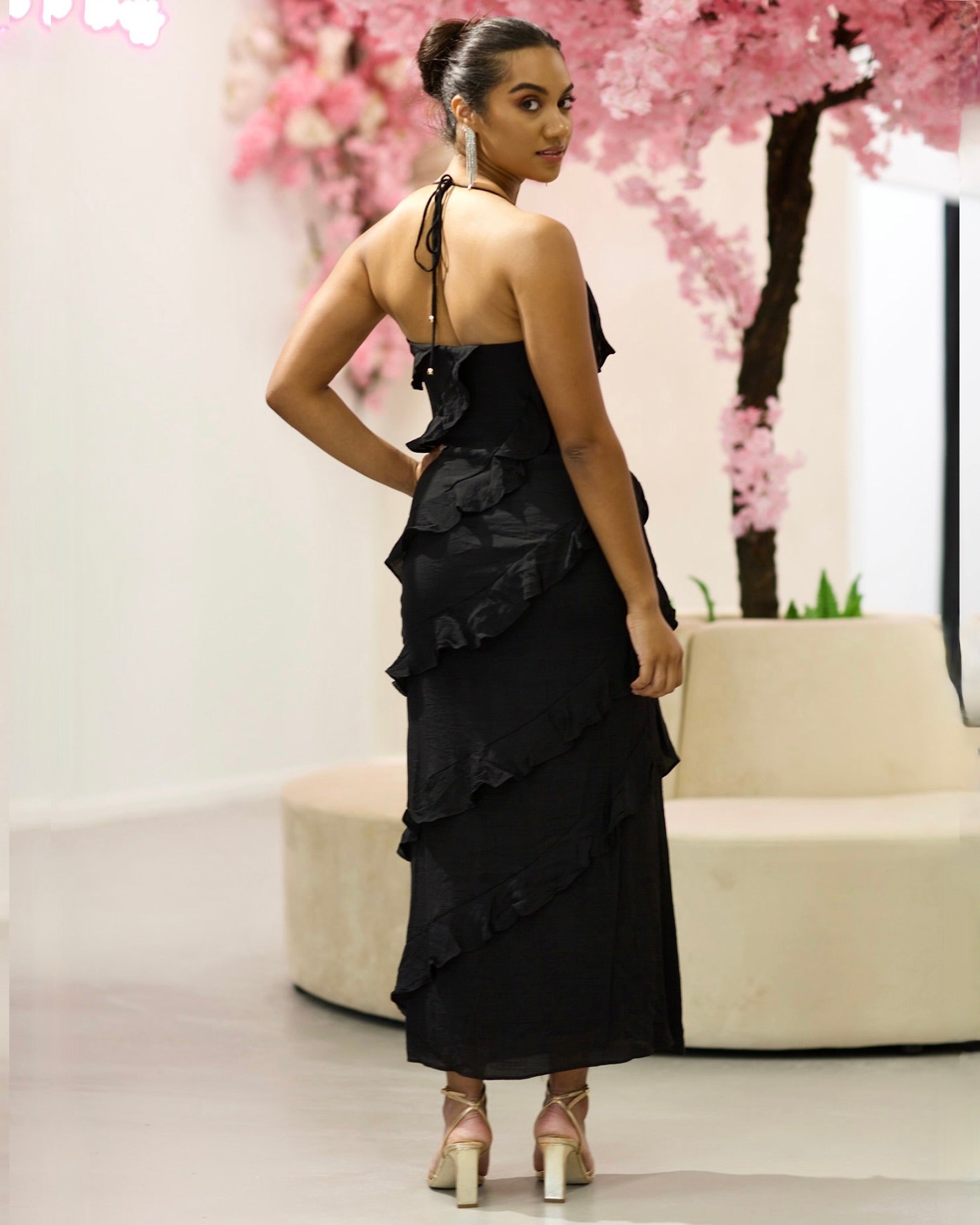 Bring luxurious sophistication to your wardrobe with the Jolene Ruffle Maxi Dress. Crafted from beautiful light weight fabric, this maxi dress features fluttering ruffles that elegantly cascade down the skirt. The halter neckline adds a touch of femininity to create a timeless look. Be the envy of any event!