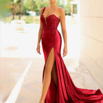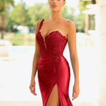 Indulge in the epitome of luxury with our Julia One Shoulder Corset Gown. The flowing silky satin skirt and elegant long train exude sophistication while the one shoulder design and corset bodice add a touch of allure. Embellished with floral lace applique, this gown is a work of art.