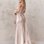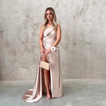 The one shoulder design of the Katherine One Shoulder Satin Gown showcases intricate cut-out details that add a touch of sensuality to your appearance. It is complemented by a front overlap slit, a snug-fitting silhouette, and an exquisite train that gracefully sweeps the floor.