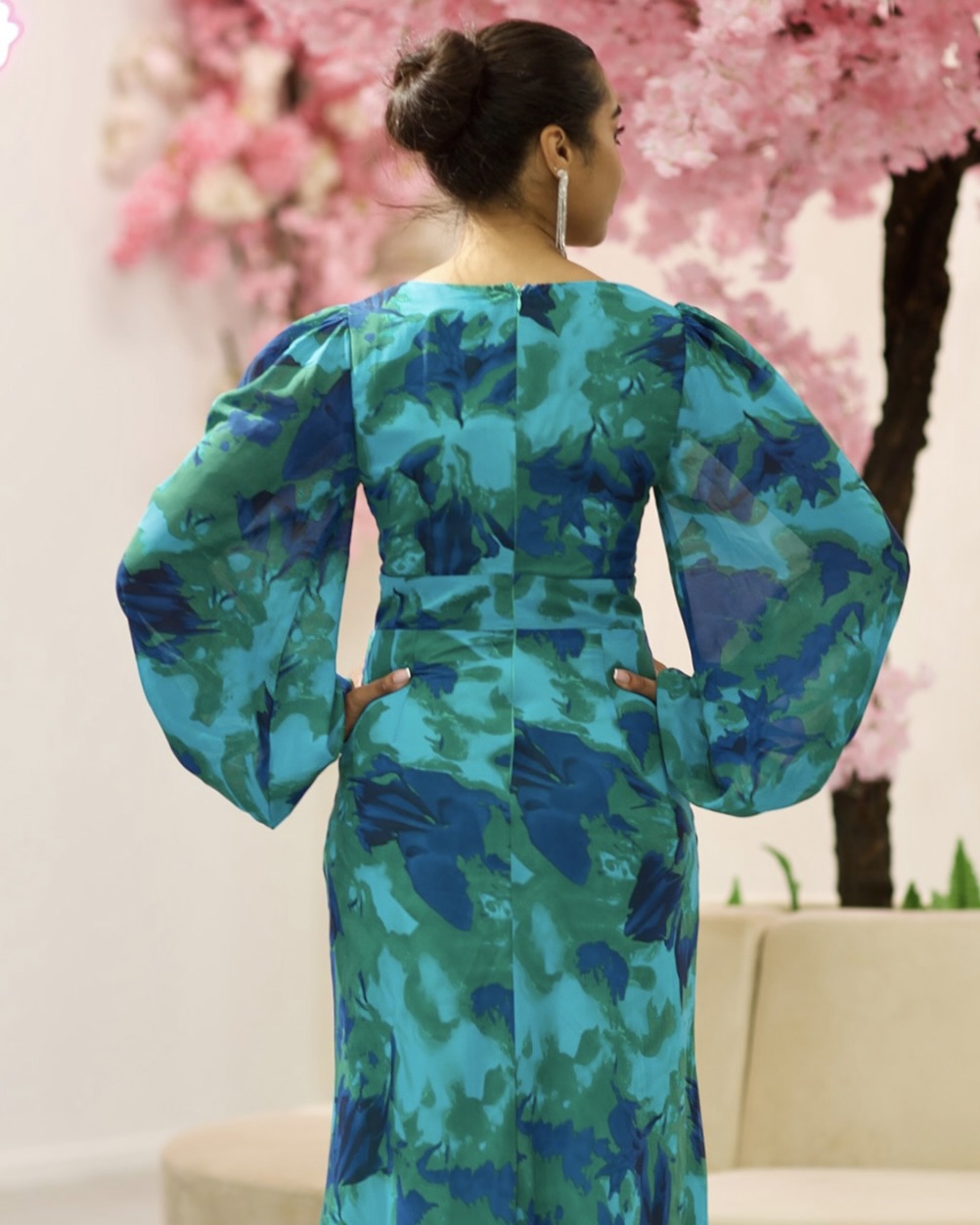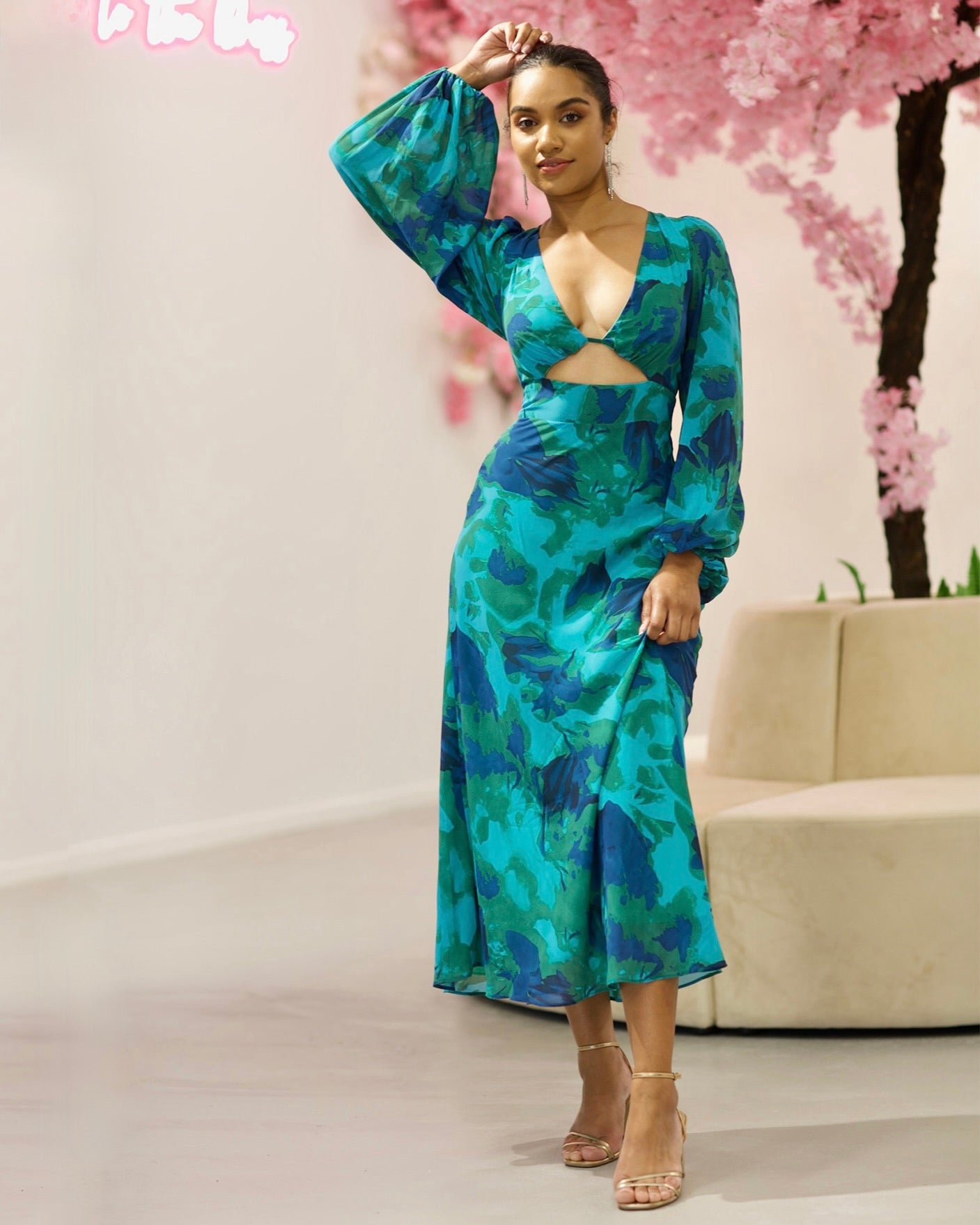 Introducing our exclusive Kora Chiffon Midi Dress in a stunning green/blue print. Crafted from luxurious chiffon fabric, this dress features long sleeves, a deep v-neckline with cut out front detail, and a flowing A-line midi skirt. Elevate your style with this elegant and exclusive piece.