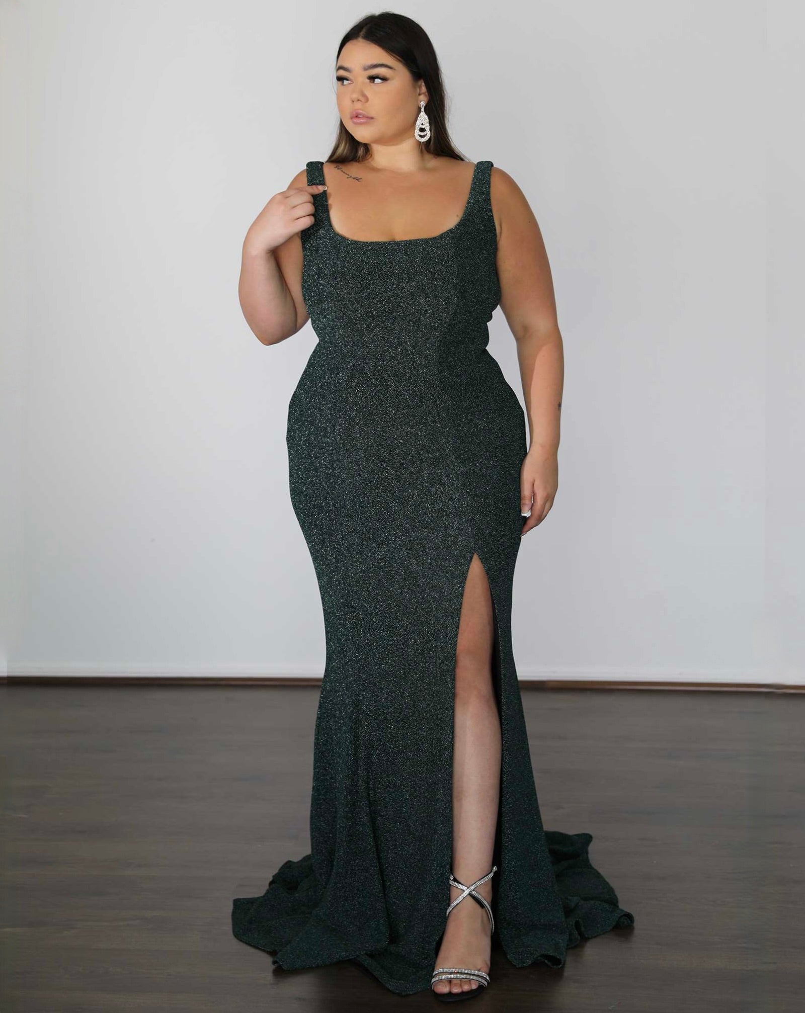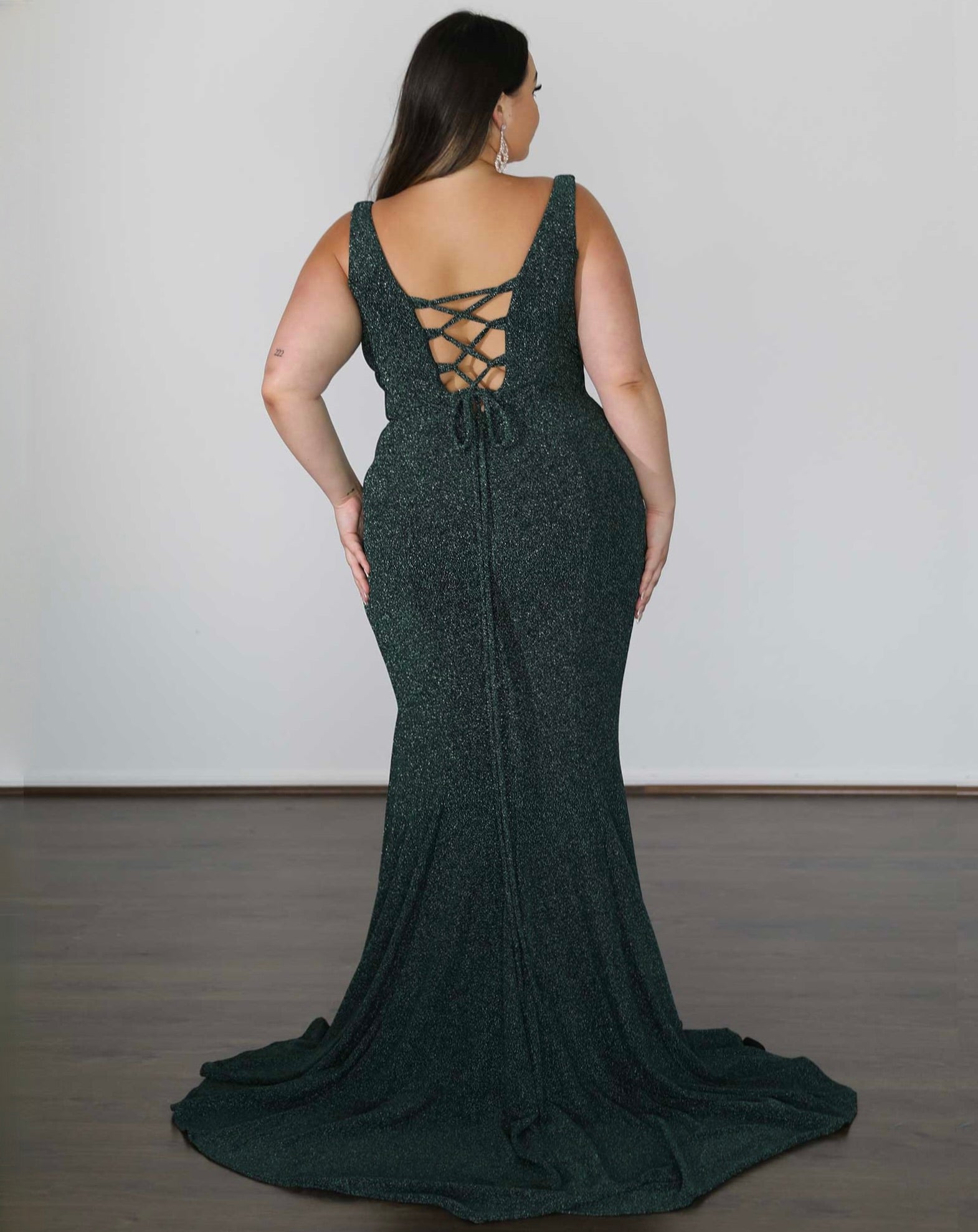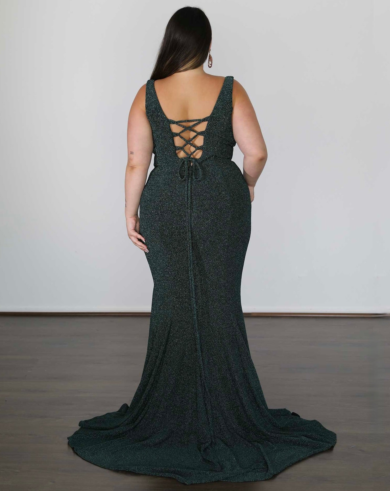 Model Ryley is wearing size 18 'Lana Forest Metallic Jersey Dress'