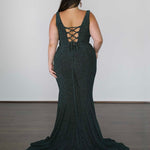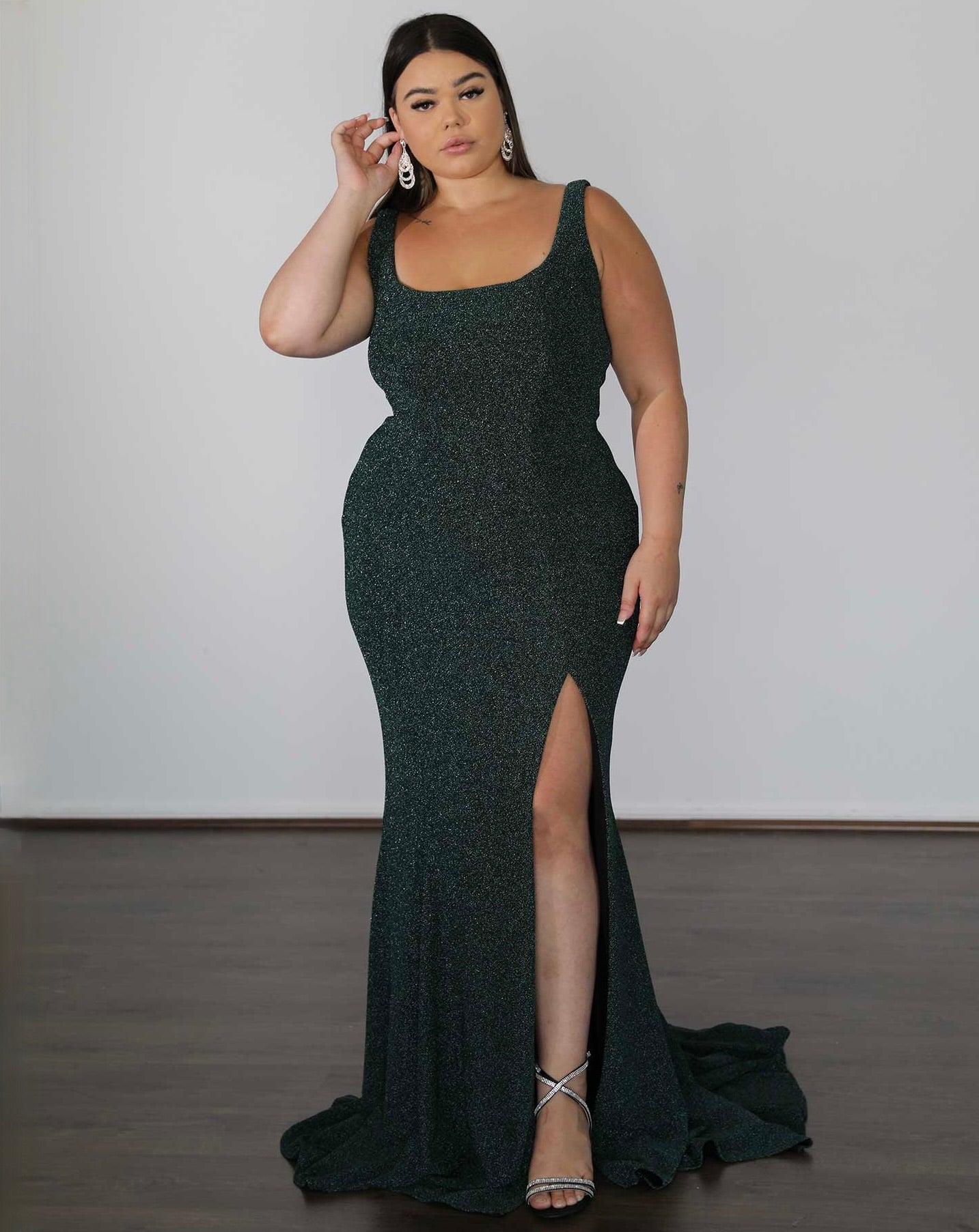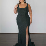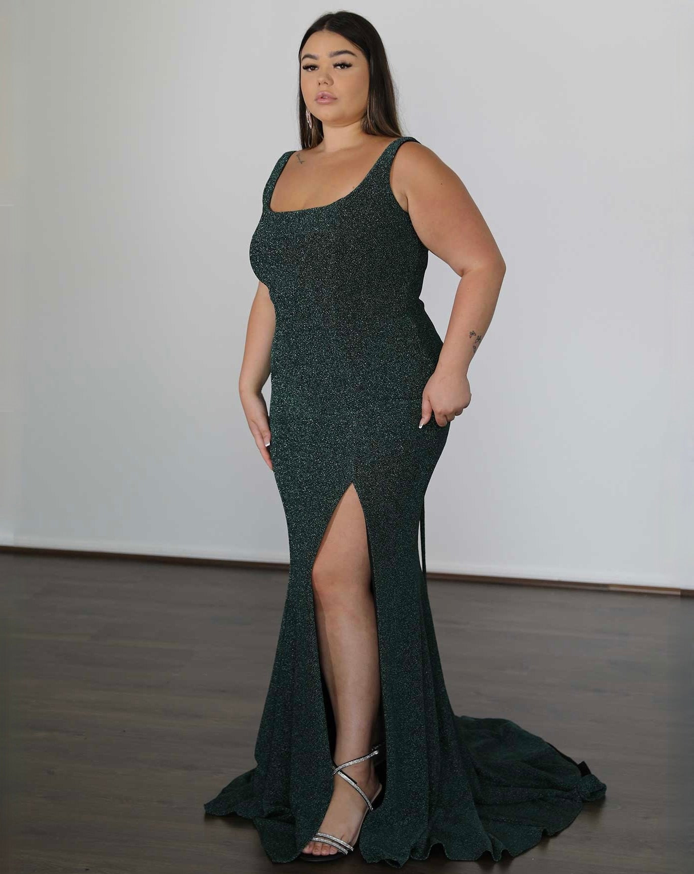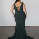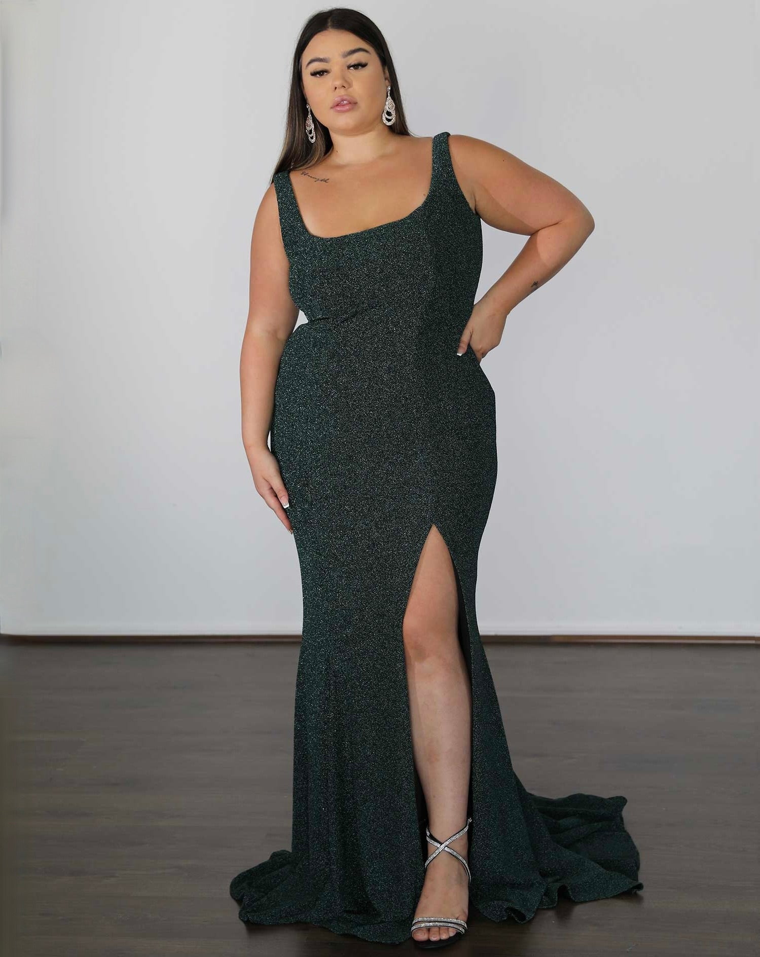 Model Ryley is wearing size 18 'Lana Forest Metallic Jersey Dress'