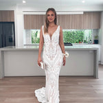 Featuring the new Letisha Sequin Gown. An astounding sequin slimline gown with floor-sweeping train featuring a deep V neckline and low back. This gown is crafted and contoured to perfection and designed to accentuate the body curve.