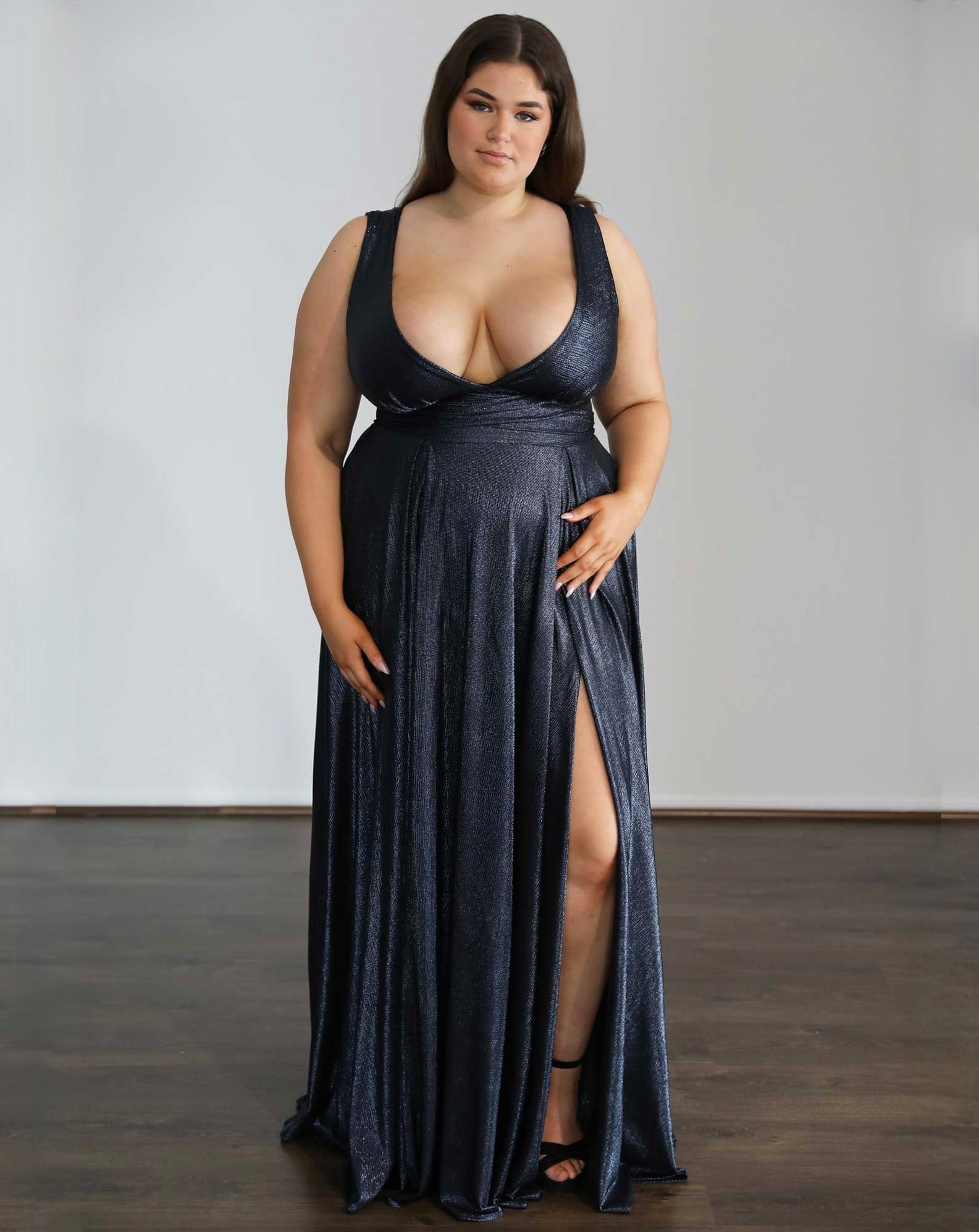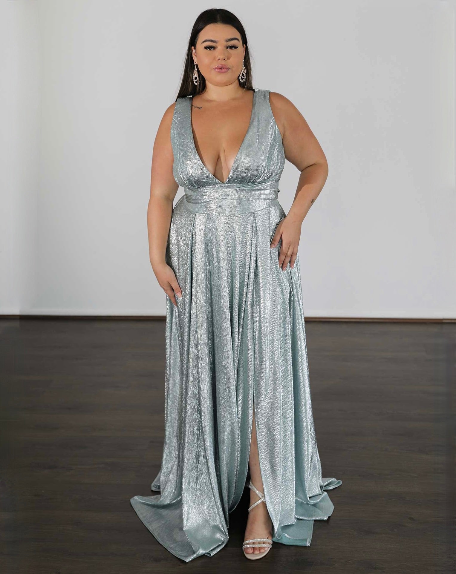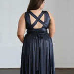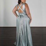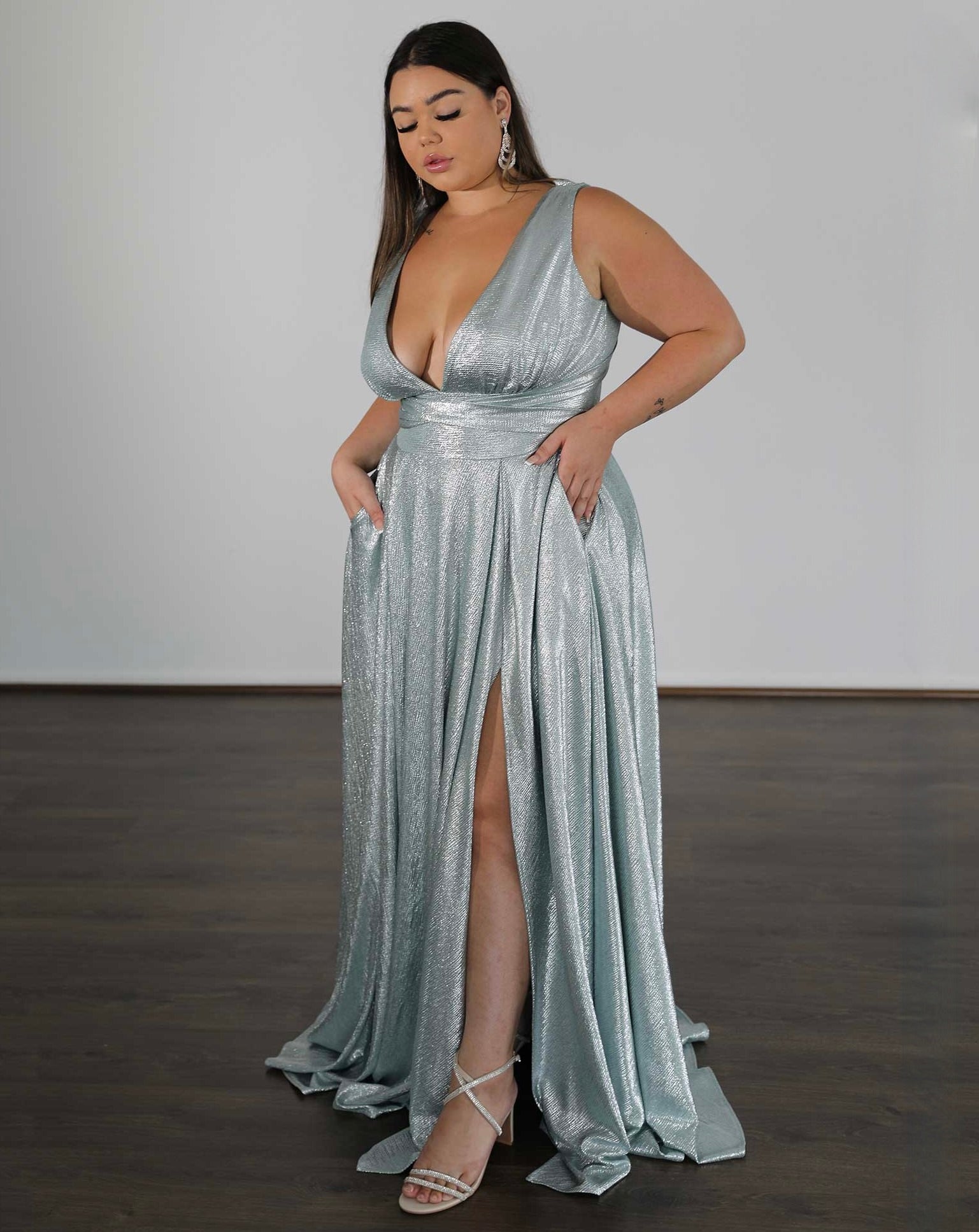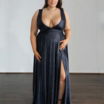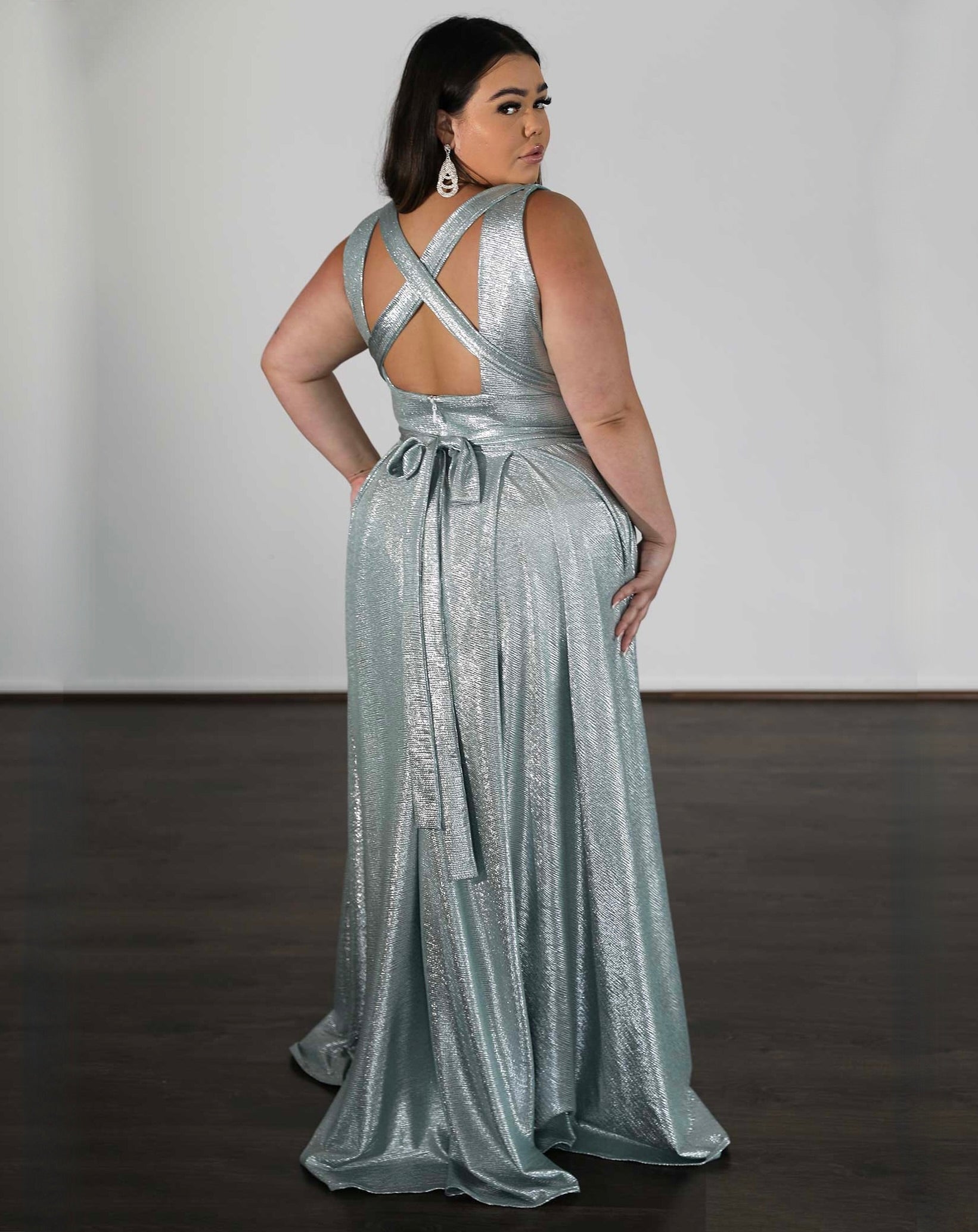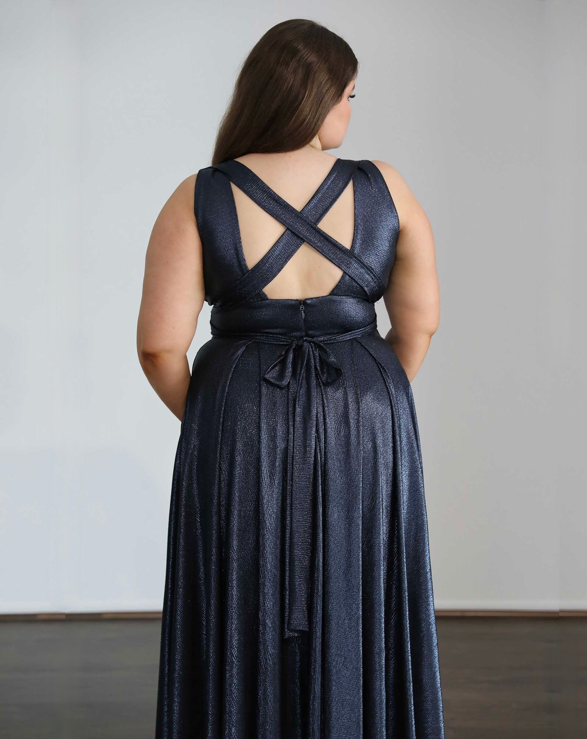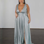Discover your new dream dress in the 'Lexa' stretch shimmer. The supportive back panels and adjustable waist tie provide the perfect fit while the plunging v-neckline and fully pleated skirt with pockets exude classic elegance. Feel like a star in this show-stopping piece from Once Labeled.
