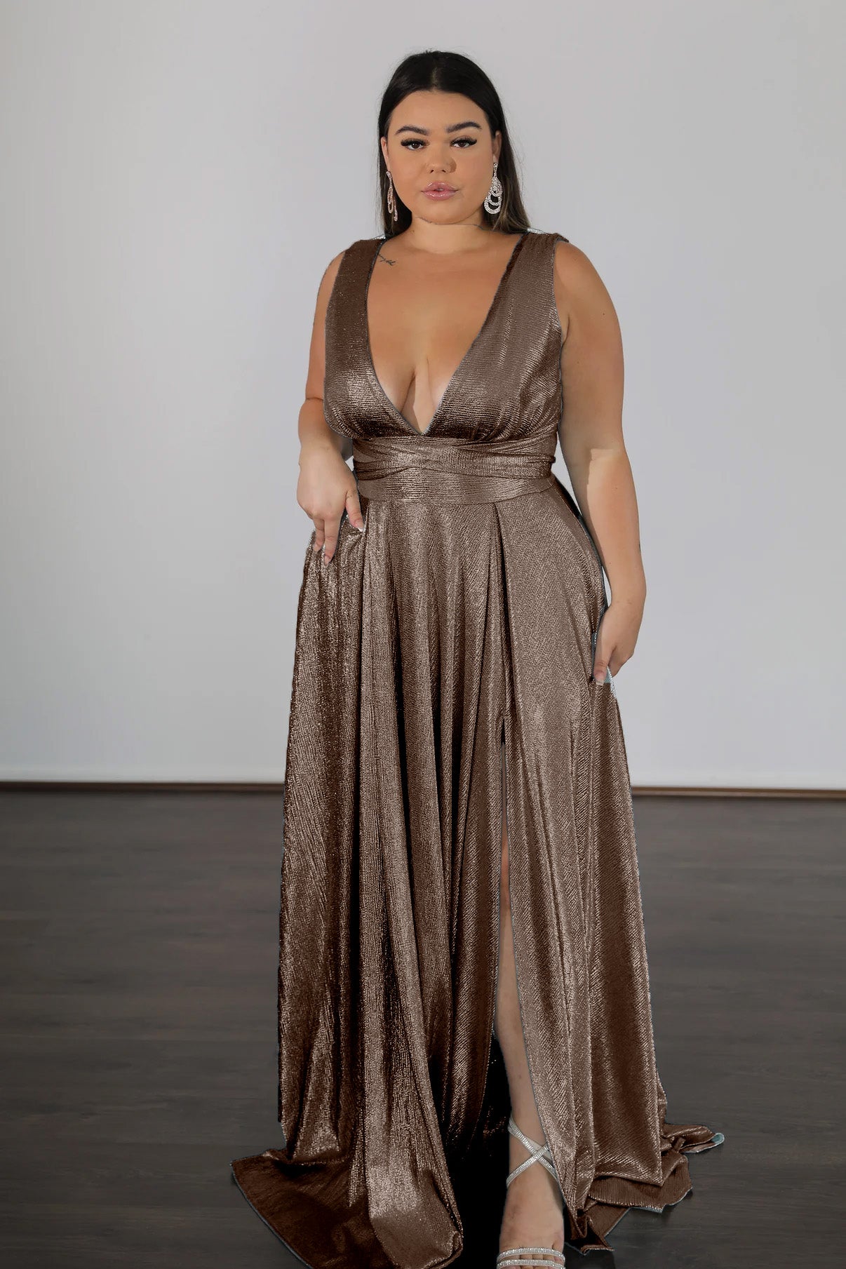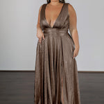Discover your new dream dress in the 'Lexa' stretch shimmer. The supportive back panels and adjustable waist tie provide the perfect fit while the plunging v-neckline and fully pleated skirt with pockets exude classic elegance. Feel like a star in this show-stopping piece from Once Labeled.